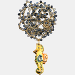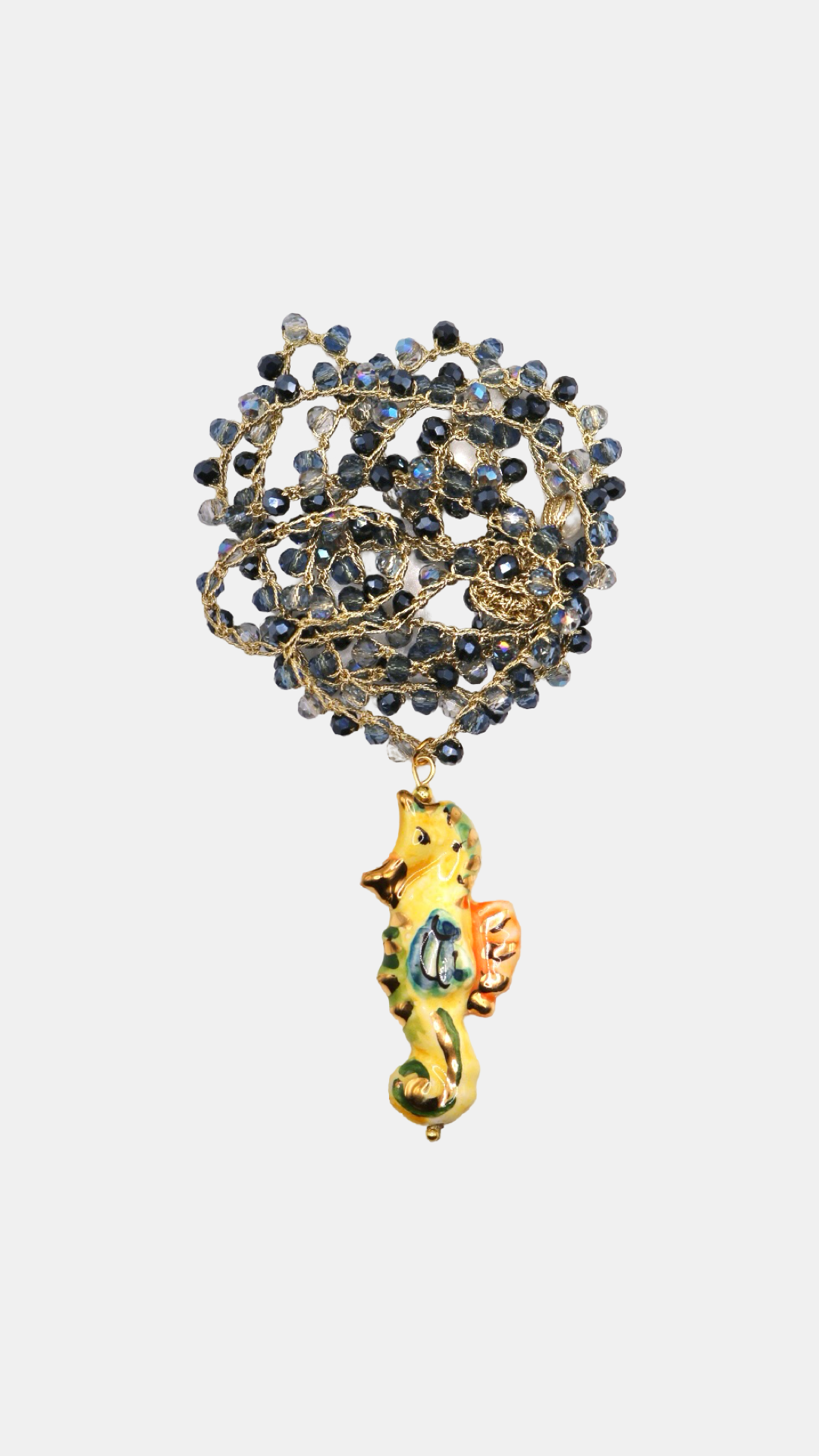 Collar de aproximadamente 95 cm hecho a mano en crochet con hilo dorado de alta calidad y piedras facetadas en tonos azules y grises. Puedes darle hasta tres vueltas al cuello. Incluye un charm de caballito de mar en tono amarillo.