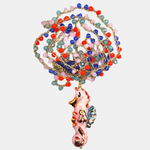 Collar de aproximadamente 95 cm hecho a mano en crochet con hilo dorado de alta calidad y piedras facetadas en tonos rosas y azules. Puedes darle hasta tres vueltas al cuello. Incluye un charm de caballito de mar en tonos rosas.