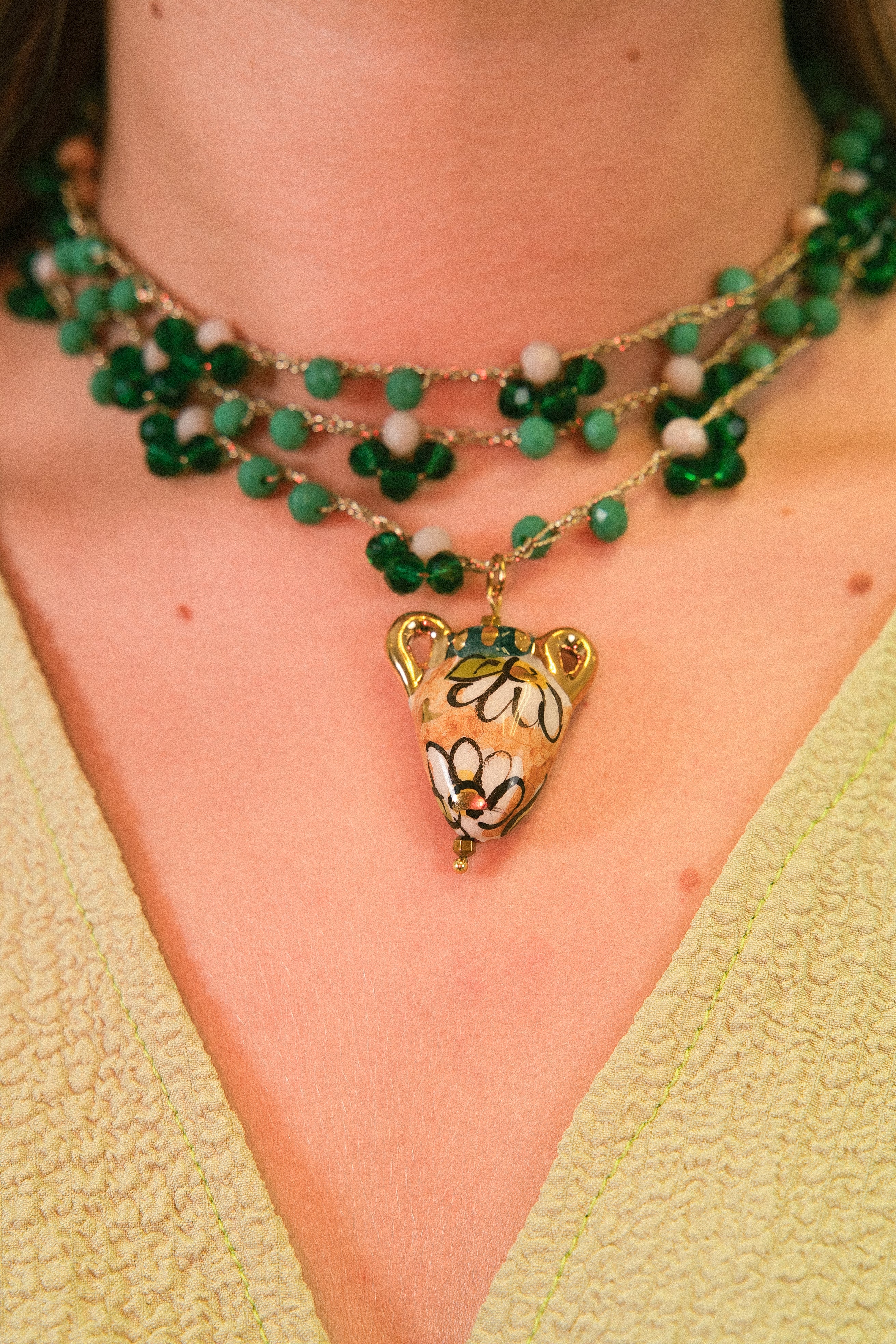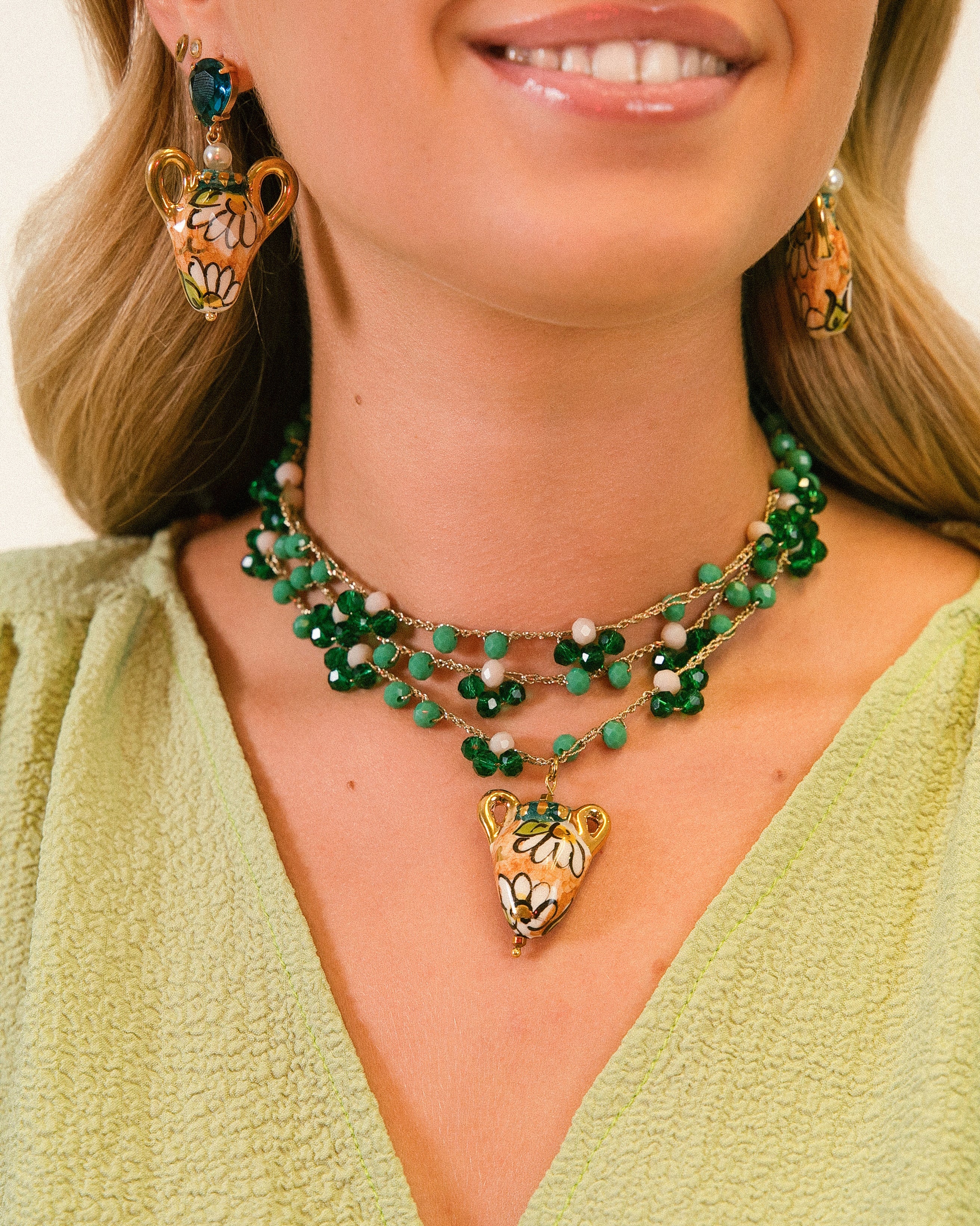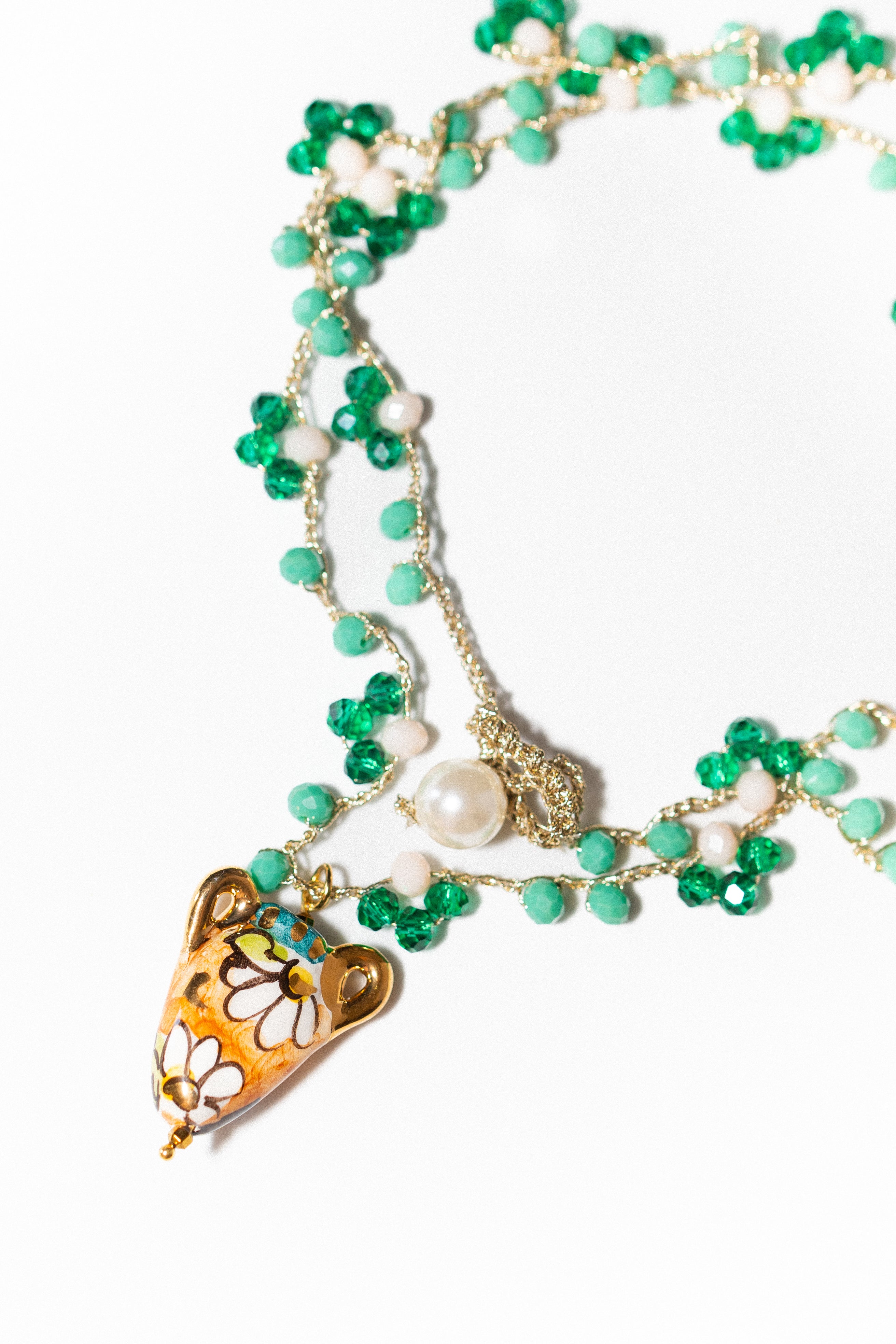 Descubre la elegancia y el encanto del arte siciliano con nuestro exclusivo collar hecho a mano. Cada pieza es una obra maestra de cerámica pintada a mano por nuestros artesanos locales de Sicilia, que capturan la esencia de la tradición y la cultura mediterránea. La cadena, elaborada cuidadosamente con bolas e hilo dorado de crochet, añade un toque sofisticado y artesanal que realza su belleza única.