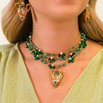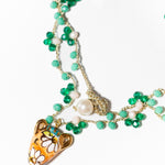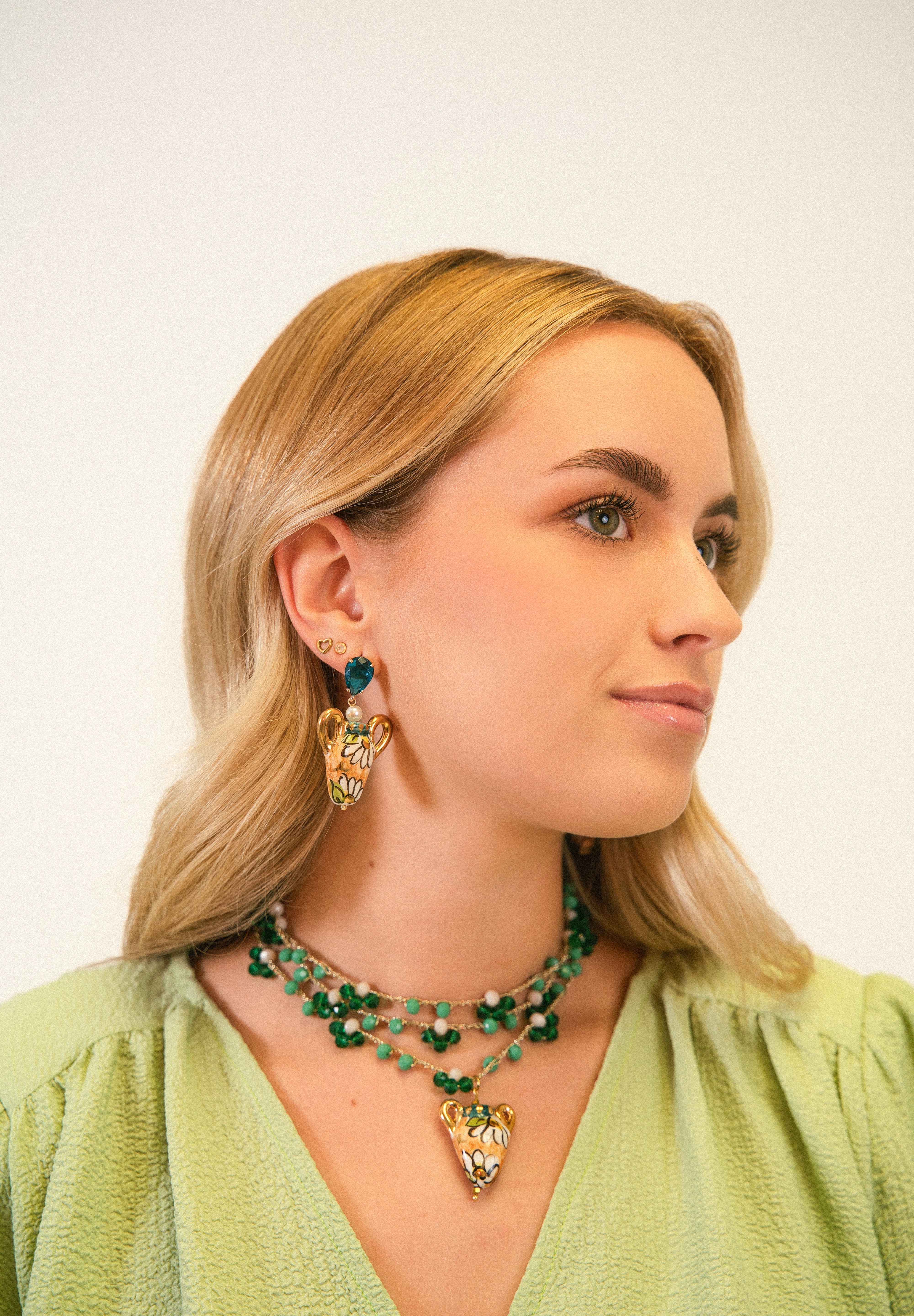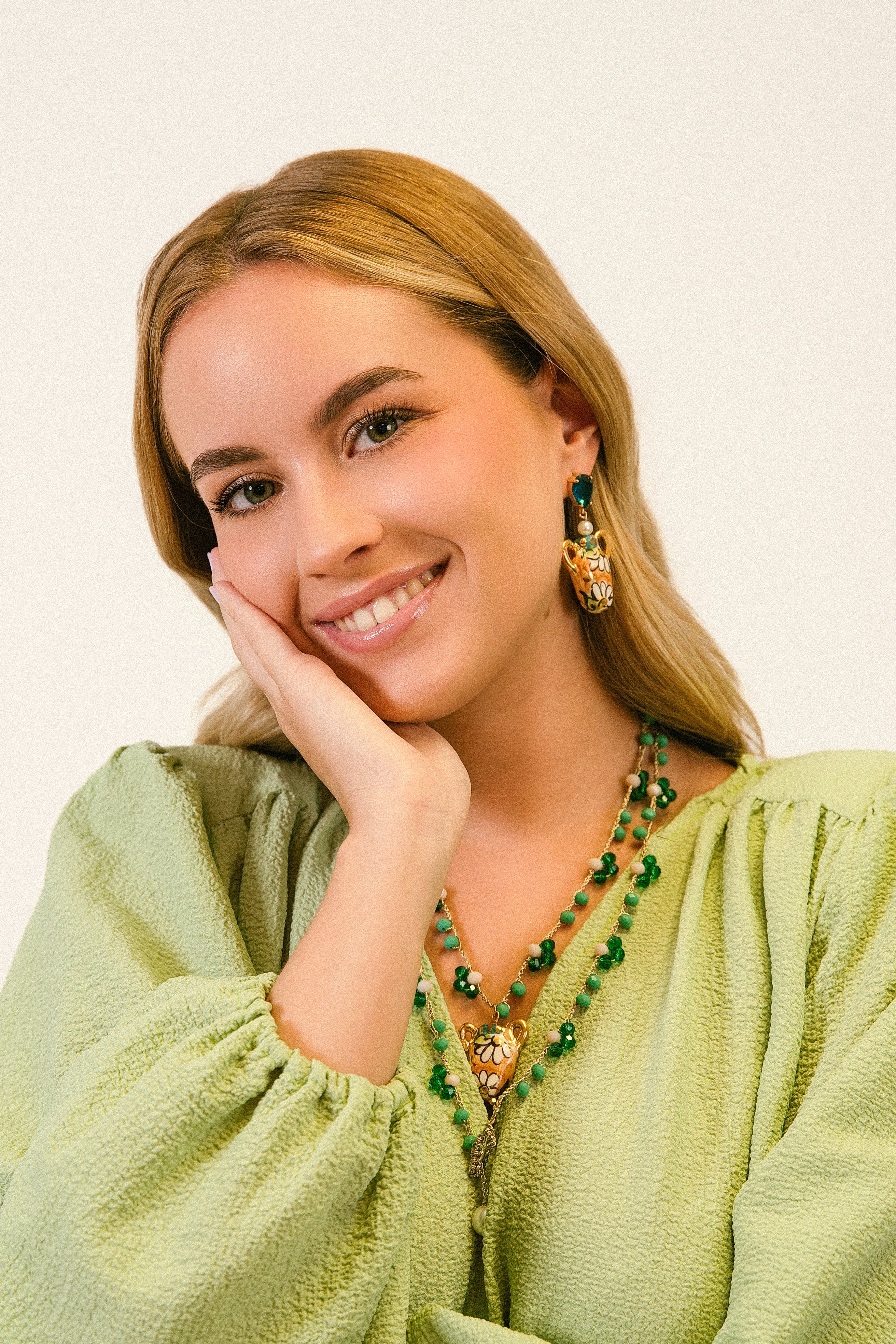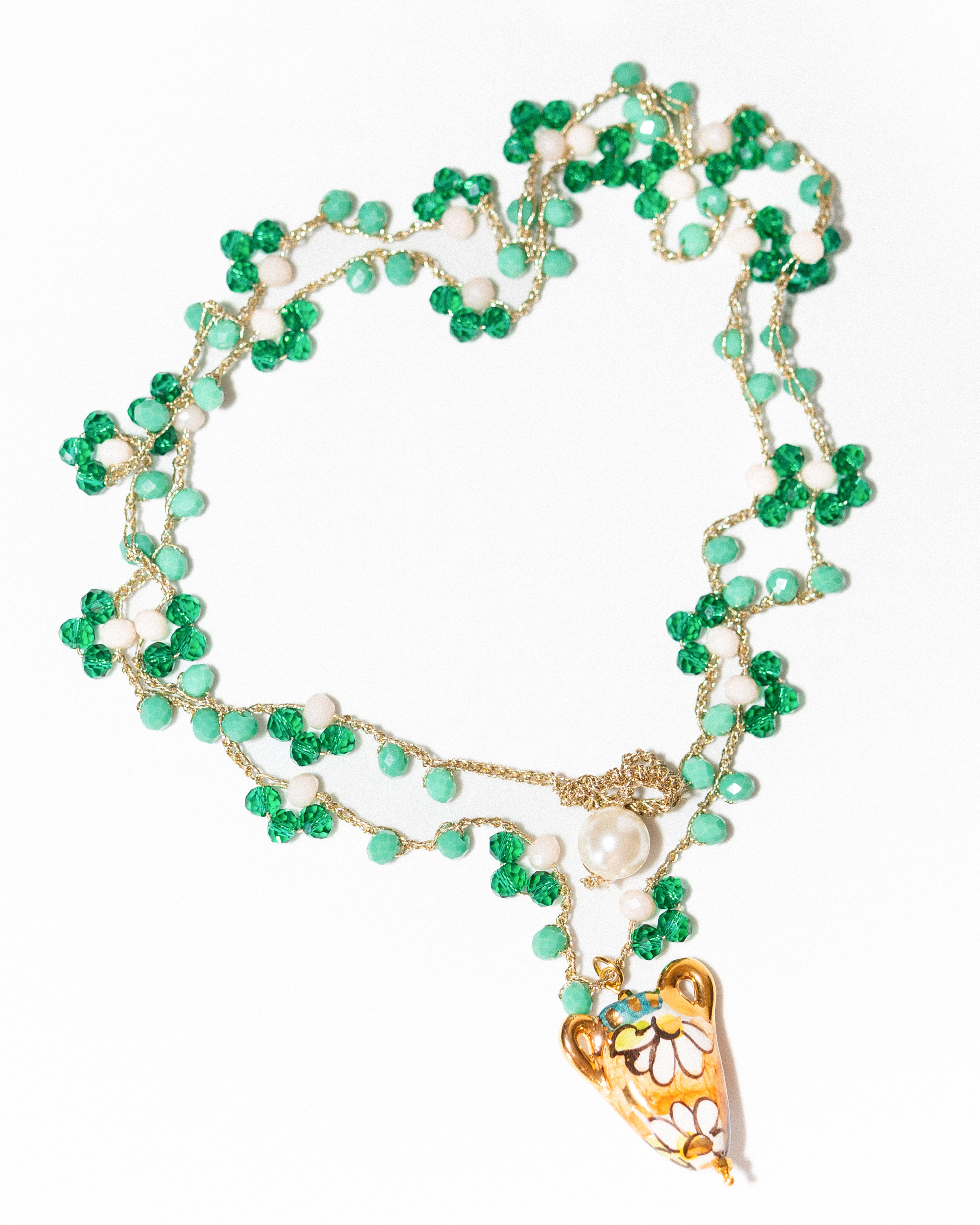 Descubre la elegancia y el encanto del arte siciliano con nuestro exclusivo collar hecho a mano. Cada pieza es una obra maestra de cerámica pintada a mano por nuestros artesanos locales de Sicilia, que capturan la esencia de la tradición y la cultura mediterránea. La cadena, elaborada cuidadosamente con bolas e hilo dorado de crochet, añade un toque sofisticado y artesanal que realza su belleza única.