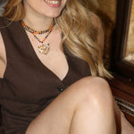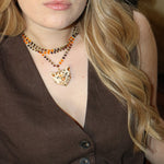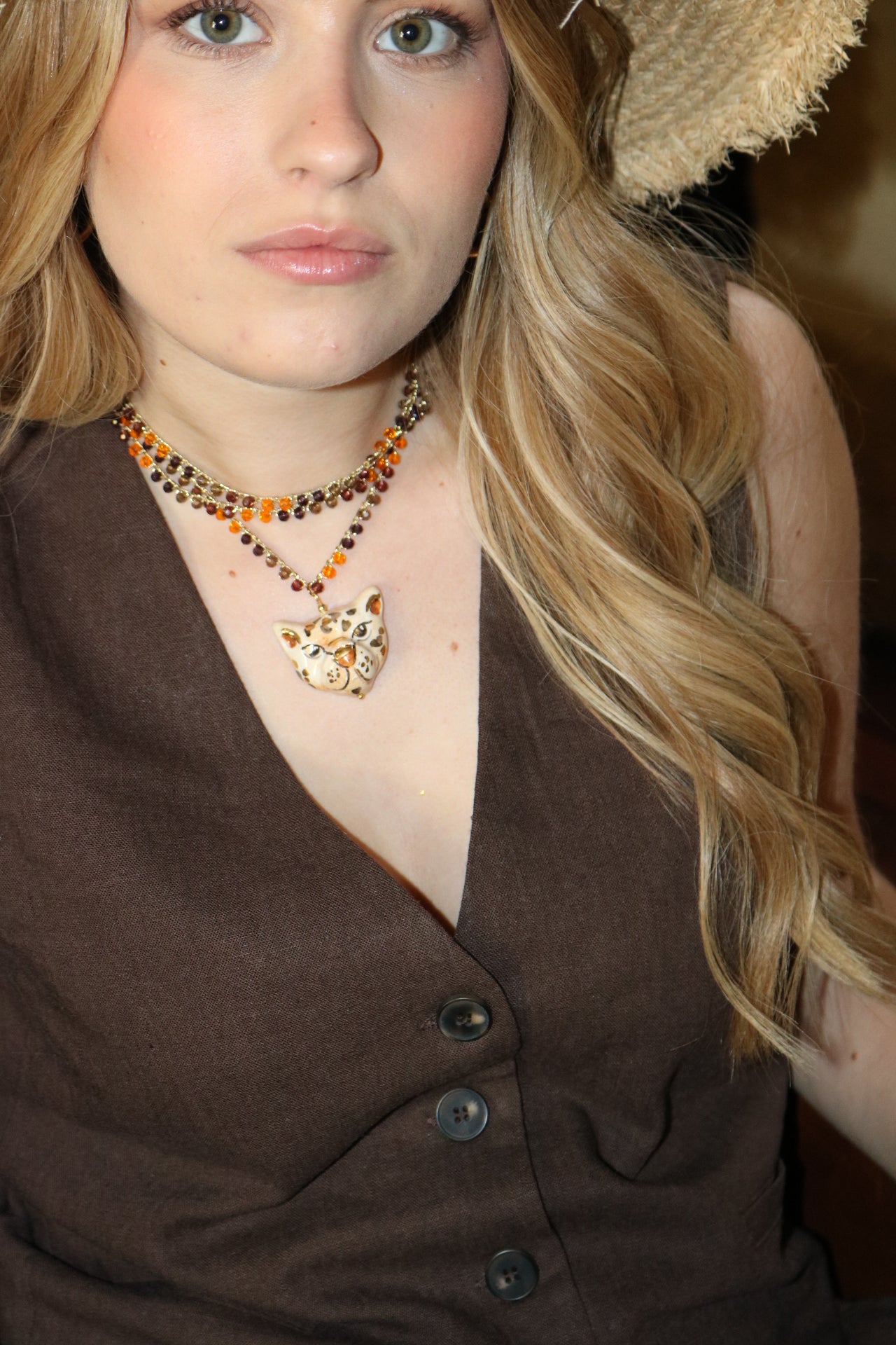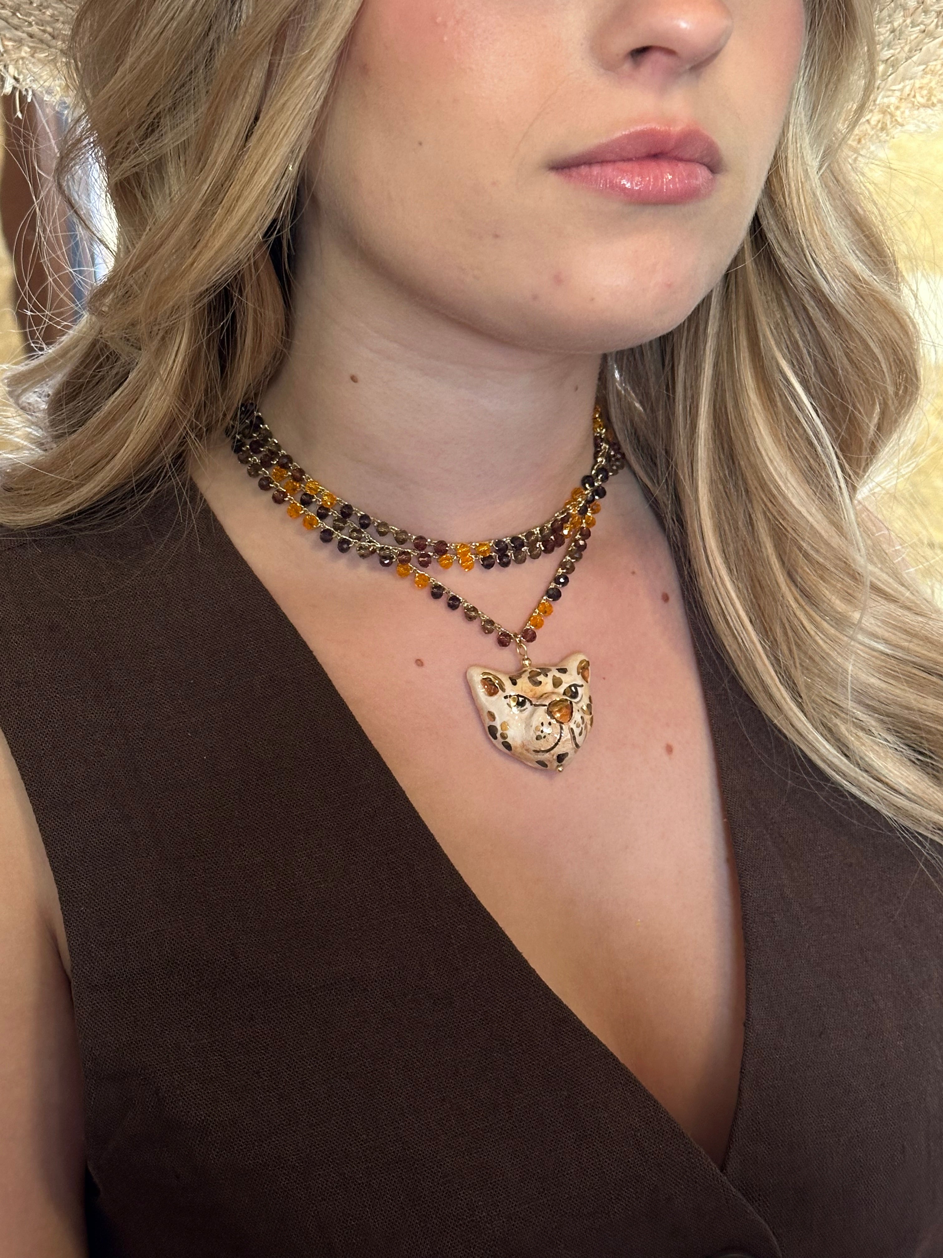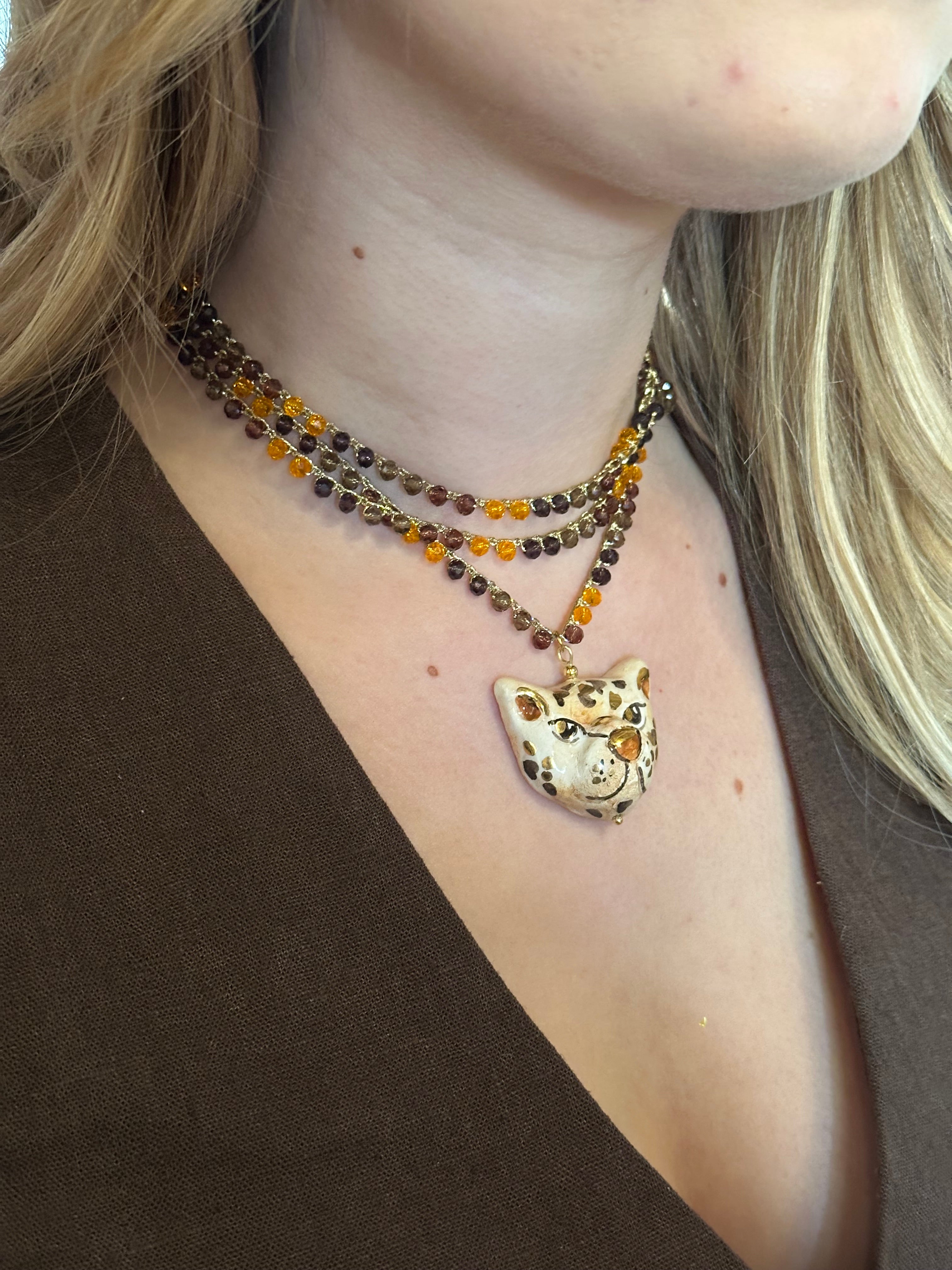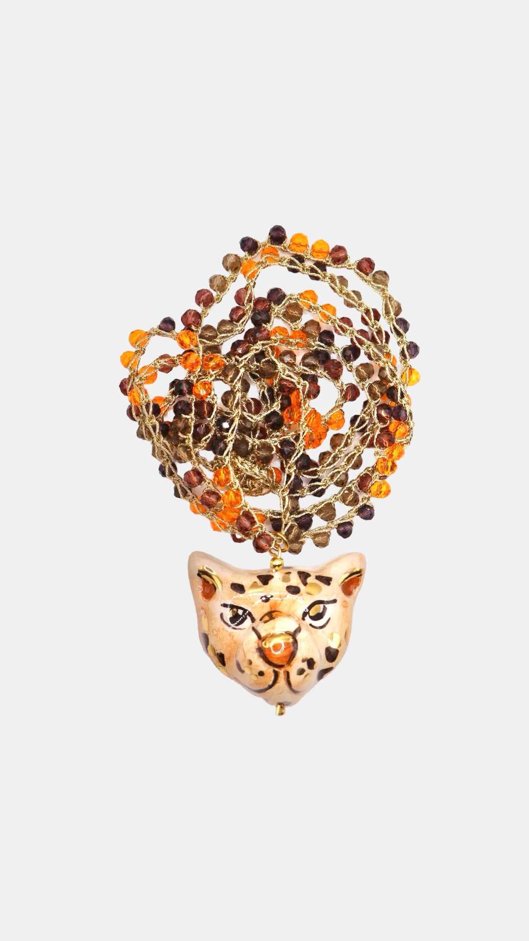 Collar de aproximadamente 95 cm hecho a mano en crochet con hilo dorado de alta calidad y piedras facetadas en tonos marron, naranja y morado. Puedes darle hasta tres vueltas al cuello. Lleva un charm de leopardo en tonos marrones y dorado.