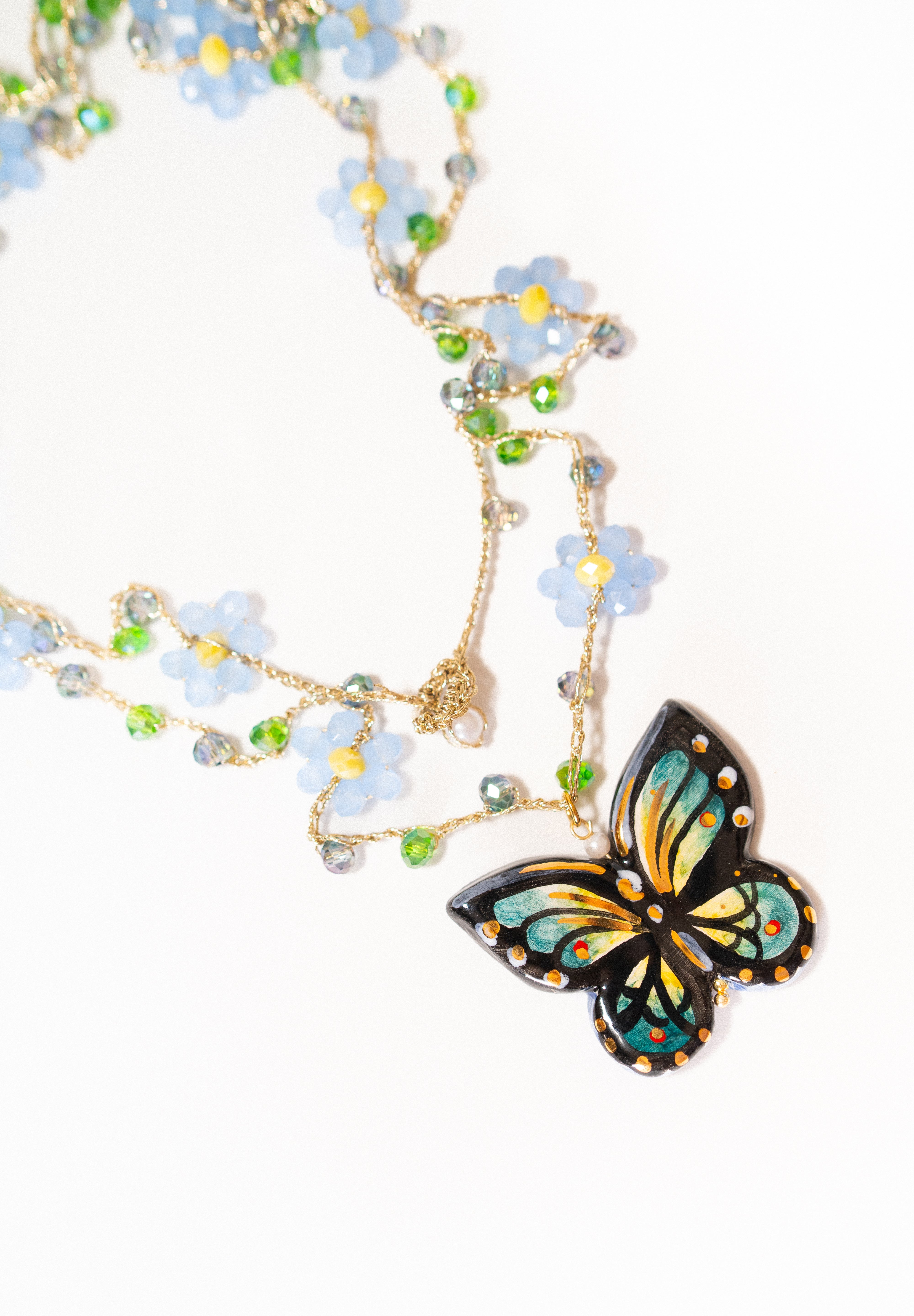 Descubre la elegancia y el encanto del arte siciliano con nuestro exclusivo collar hecho a mano. Cada pieza es una obra maestra de cerámica pintada a mano por nuestros artesanos locales de Sicilia, que capturan la esencia de la tradición y la cultura mediterránea. La cadena, elaborada cuidadosamente con bolas e hilo dorado de crochet, añade un toque sofisticado y artesanal que realza su belleza única.