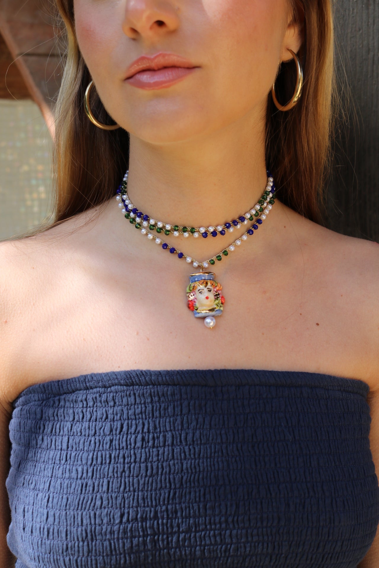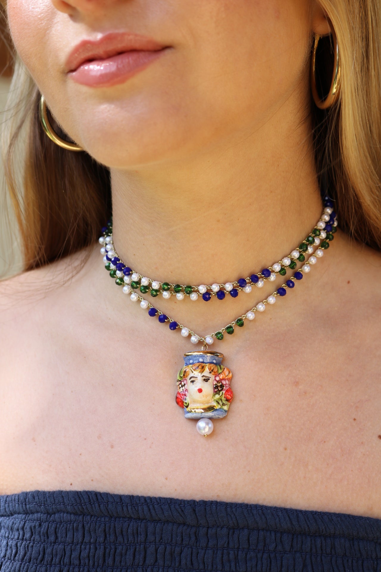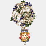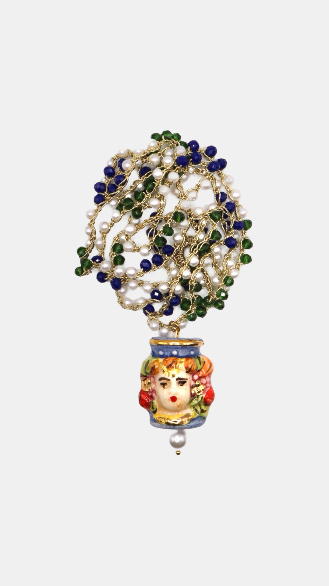 Collar de aproximadamente 95 cm hecho a mano en crochet con hilo dorado de alta calidad, perla y piedras facetadas en tonos azul y verde. Puedes darle hasta tres vueltas al cuello. Lleva un charm de testa di moro en tonos azules.