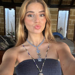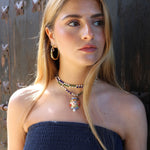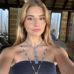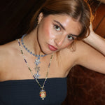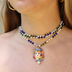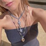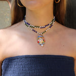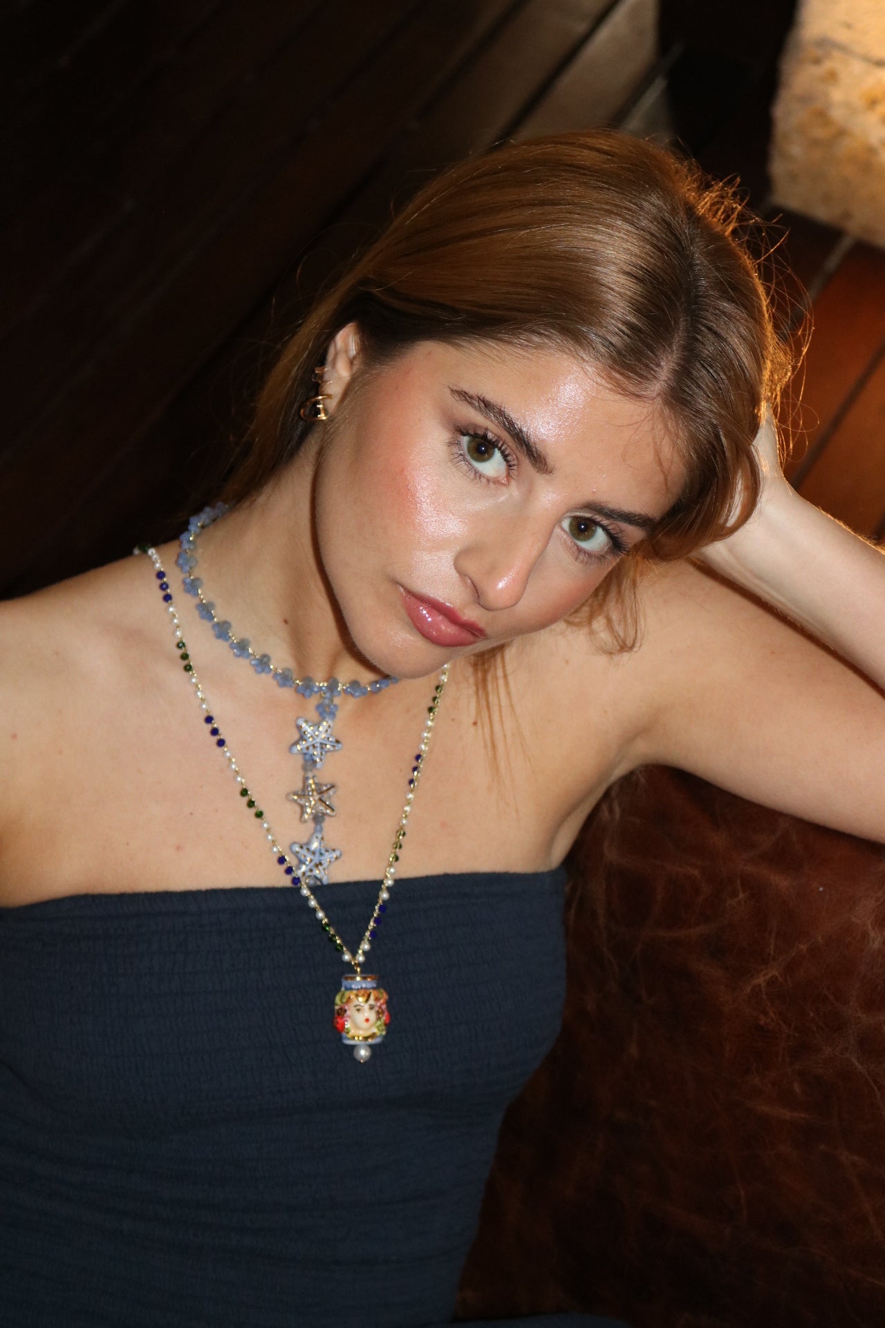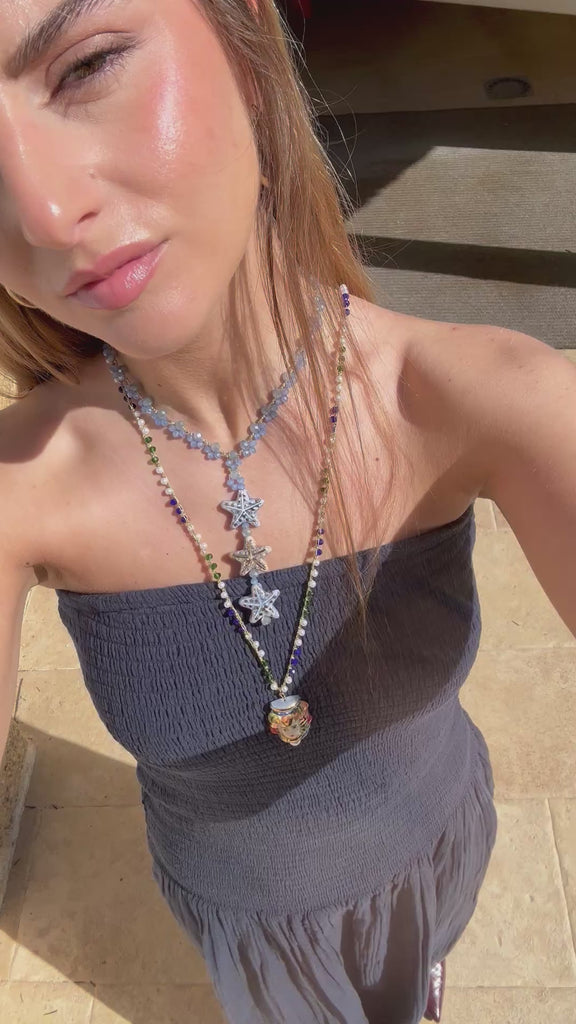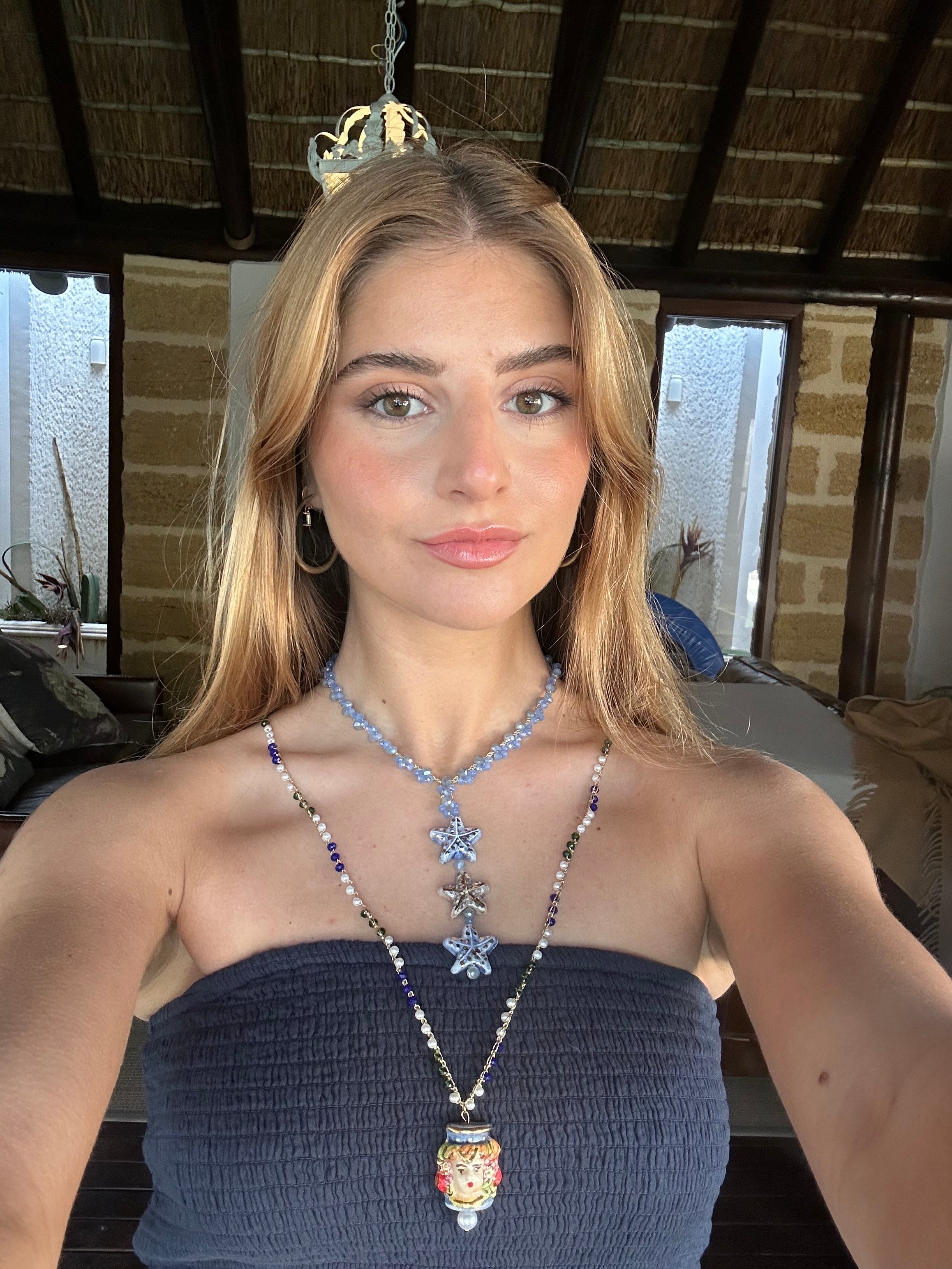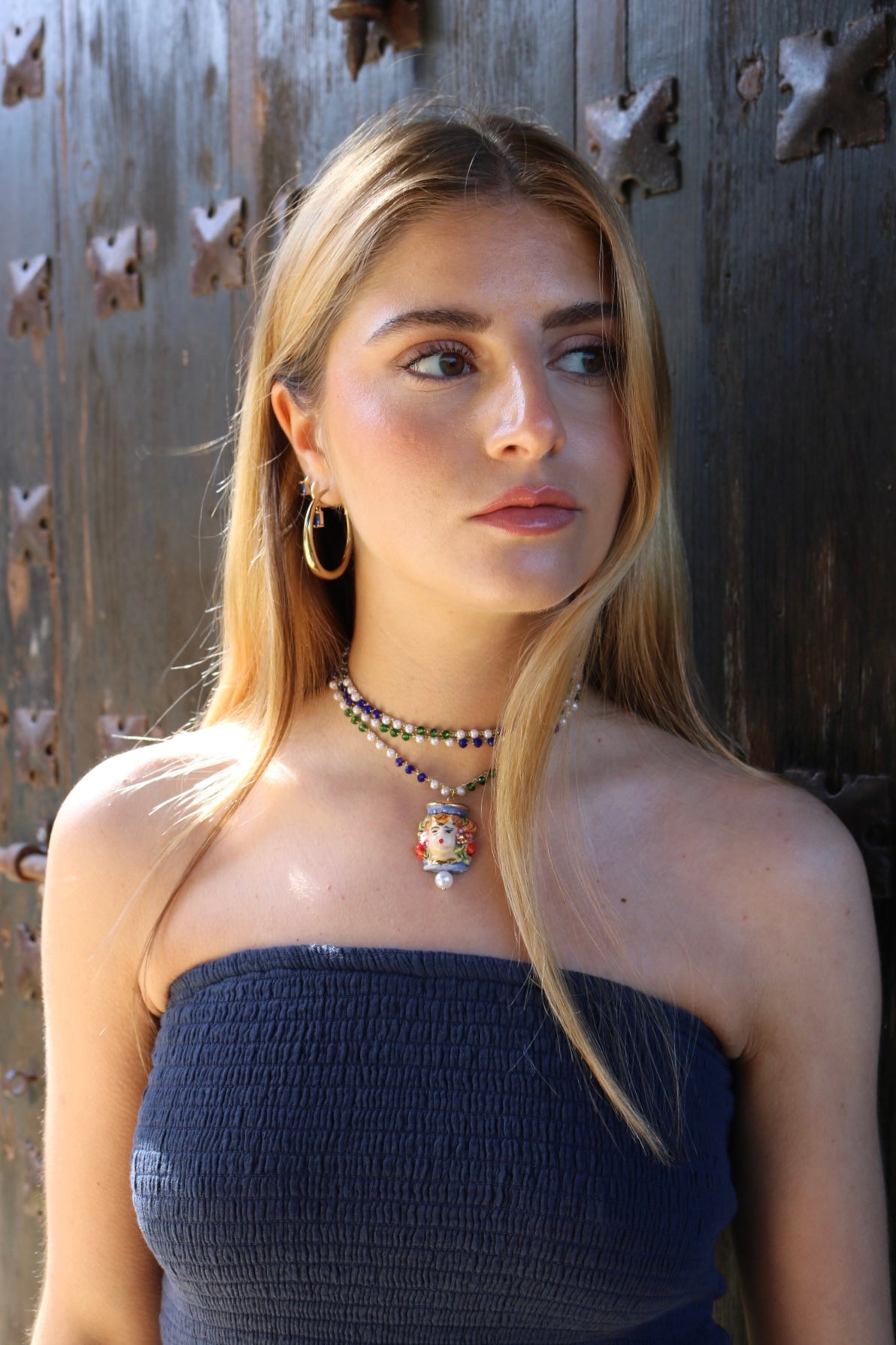 Collar de aproximadamente 95 cm hecho a mano en crochet con hilo dorado de alta calidad, perla y piedras facetadas en tonos azul y verde. Puedes darle hasta tres vueltas al cuello. Lleva un charm de testa di moro en tonos azules.