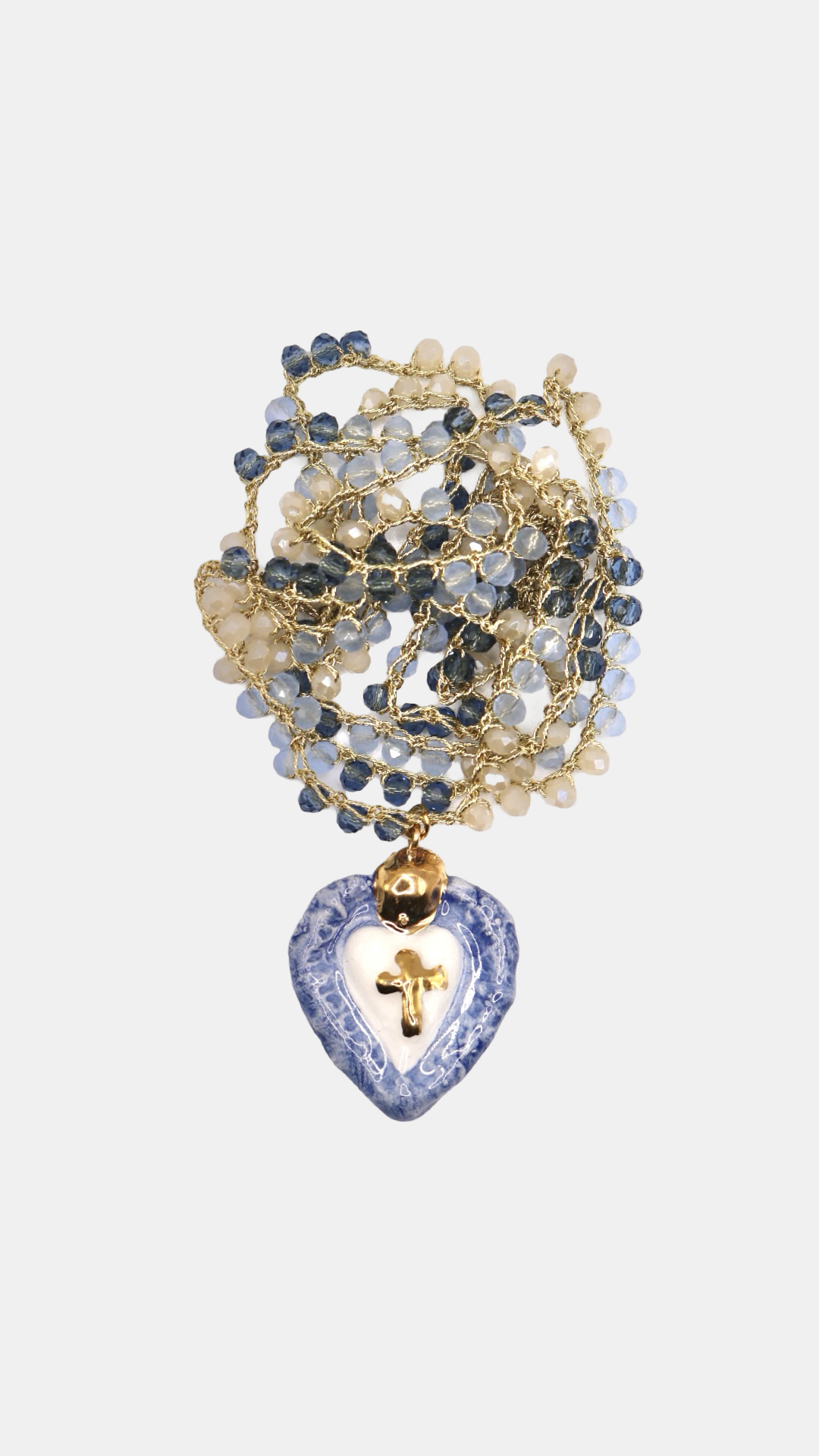Collar de aproximadamente 95 cm hecho a mano en crochet con hilo dorado de alta calidad y piedras facetadas en tonos beige y azules. Puedes darle hasta tres vueltas al cuello. Lleva un charm de sagrado corazón en tonos azul, blanco y dorado.