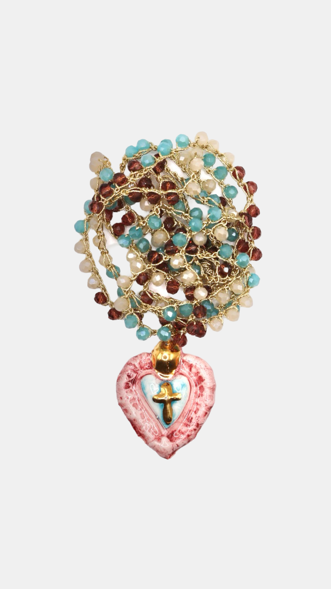 Collar de aproximadamente 95 cm hecho a mano en crochet con hilo dorado de alta calidad y piedras facetadas en tonos beige, vino y azul. Puedes darle hasta tres vueltas al cuello. Lleva un charm de sagrado corazón en tonos rosa,  azul y dorado.