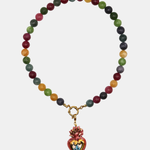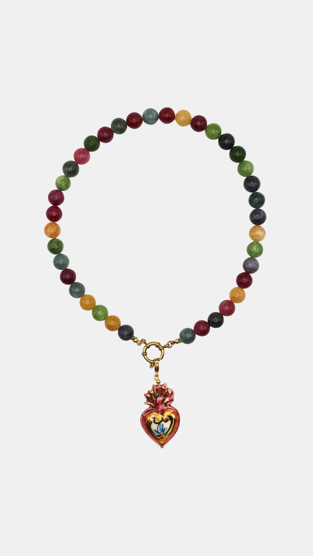 Collar de piedra natural turmalina engarzado a mano con cierre marinero, acompañado de charm de cerámica en forma de sagrado corazón. Mide 42,5 cm.
