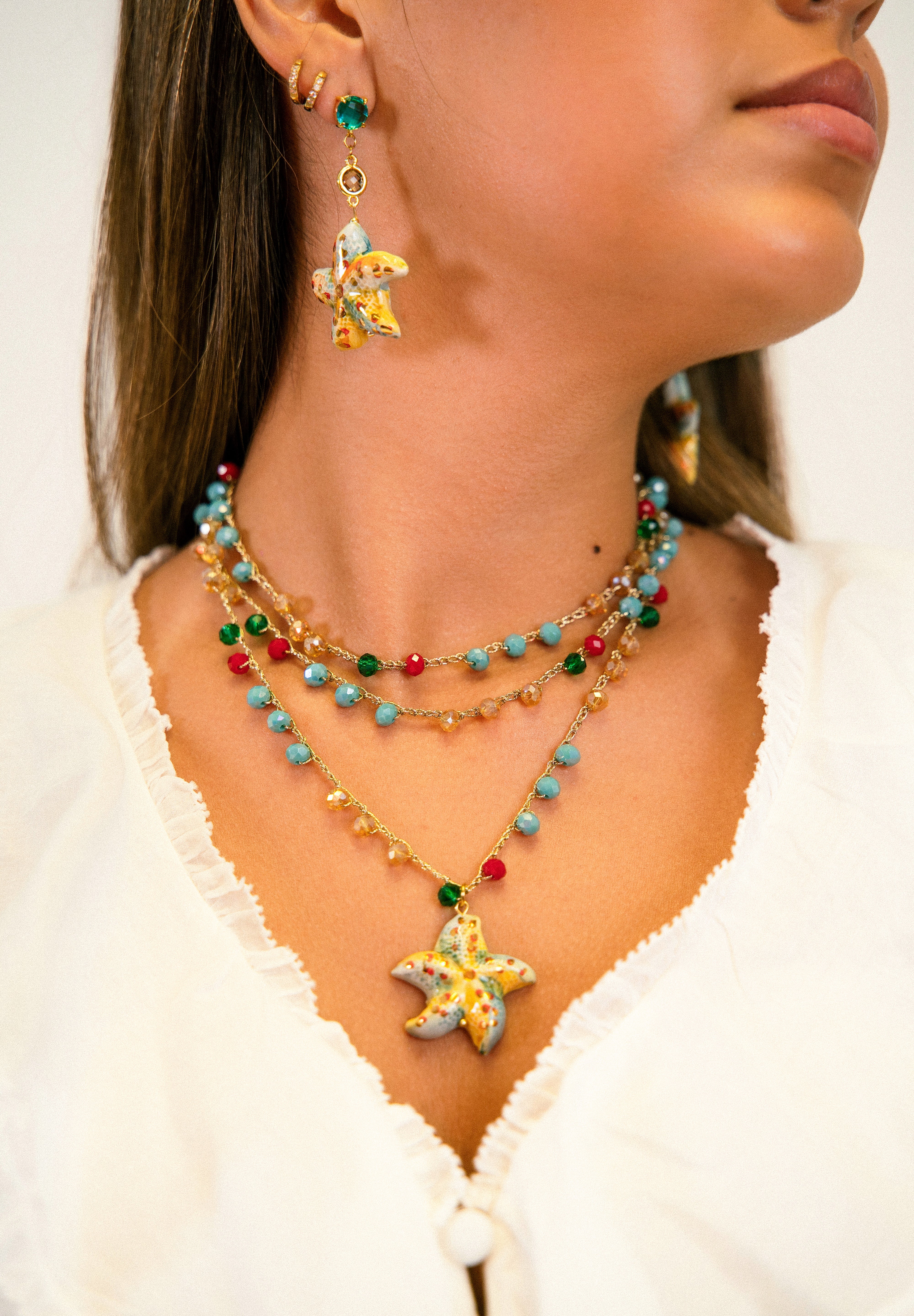 Cada pieza está hecha a mano con materiales seleccionados con cariño: perlas naturales, cuentas de vidrio, cerámica pintada, cristales y acabados dorados de alta calidad. Siempre buscamos que sean resistentes, cómodos y con mucho brillo.