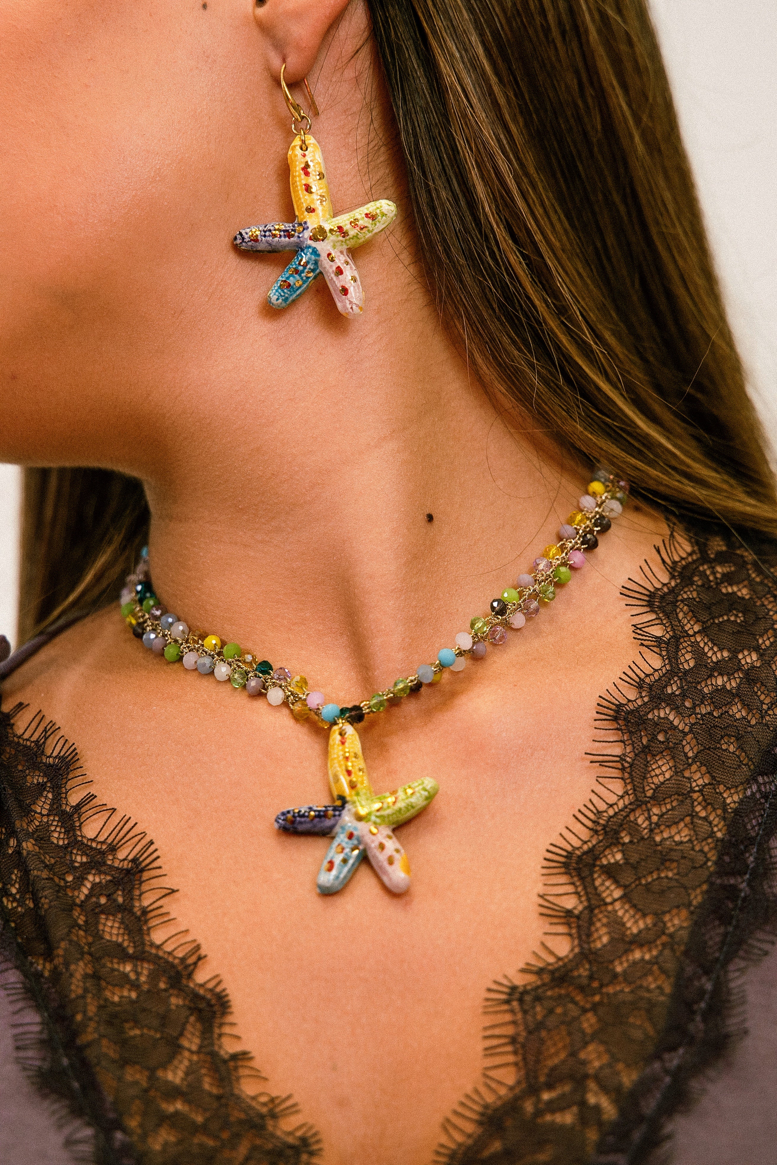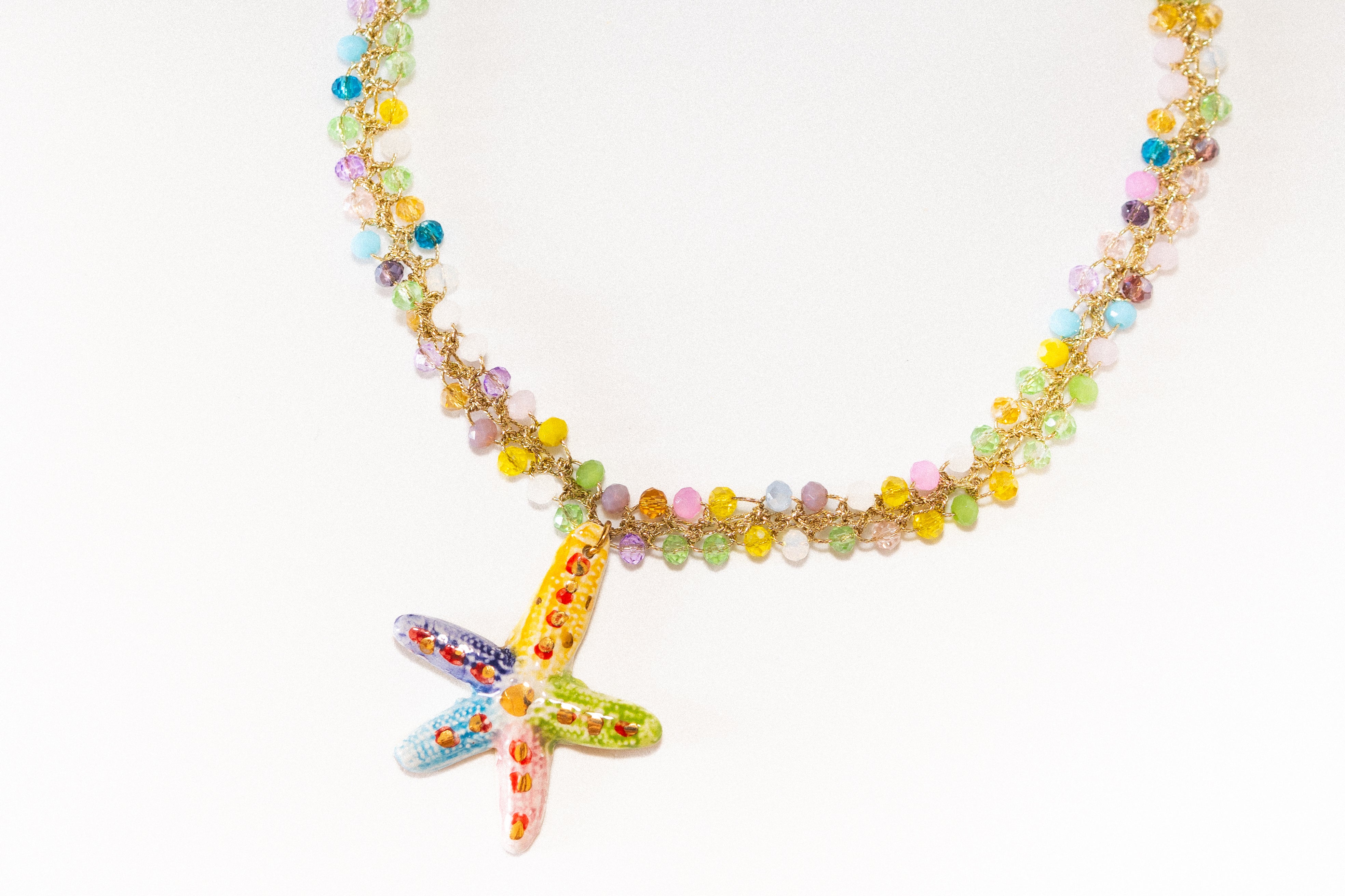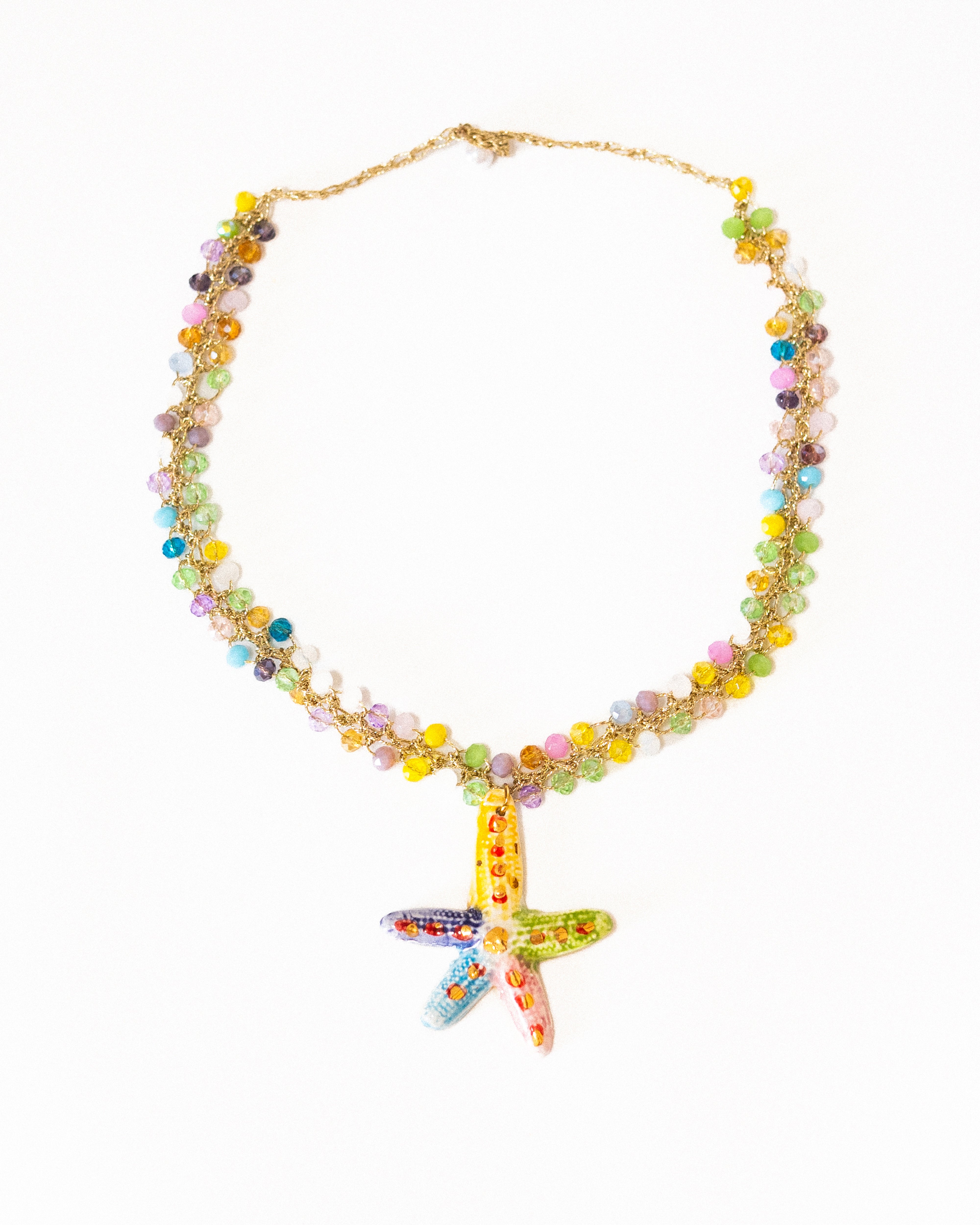 Descubre la elegancia y el encanto del arte siciliano con nuestro exclusivo collar hecho a mano. Cada pieza es una obra maestra de cerámica pintada a mano por nuestros artesanos locales de Sicilia, que capturan la esencia de la tradición y la cultura mediterránea. La cadena, elaborada cuidadosamente con bolas e hilo dorado de crochet, añade un toque sofisticado y artesanal que realza su belleza única.