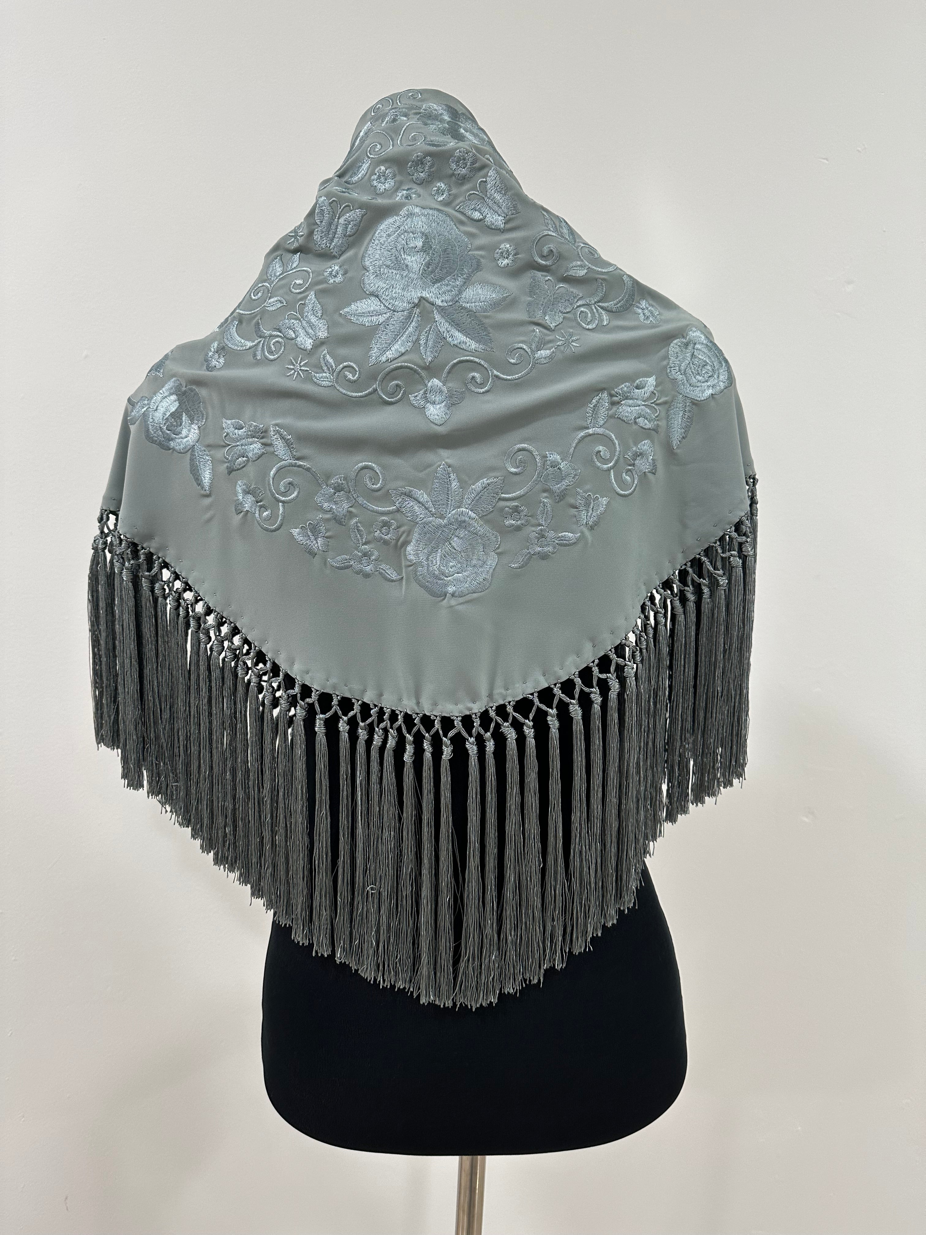 Mantón gris plata bordado al tono