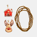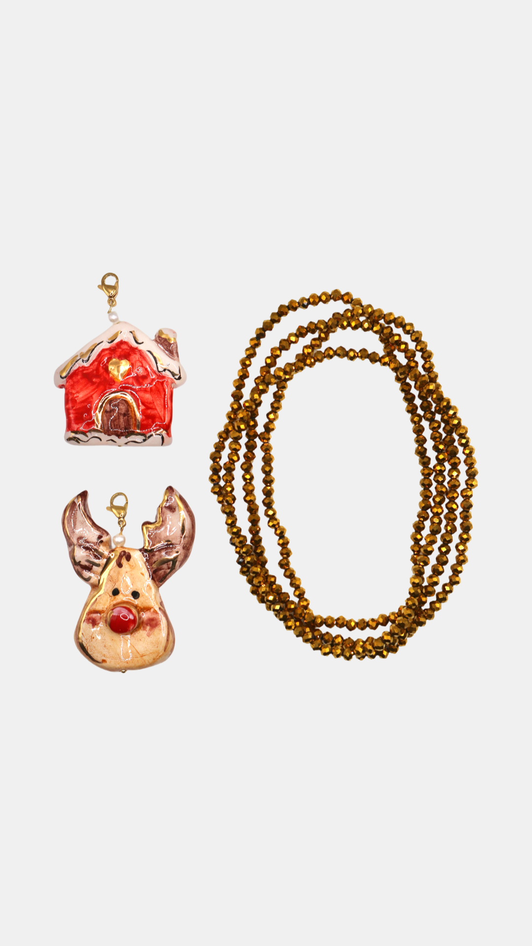 Pack de dos charms de cerámica pintada a mano en edición limitada, con diseño de casita navideña y reno. Incluye una cadena de cuentas de cristal dorado facetado, perfecta para combinar y crear un accesorio festivo, artesanal y lleno de encanto.