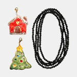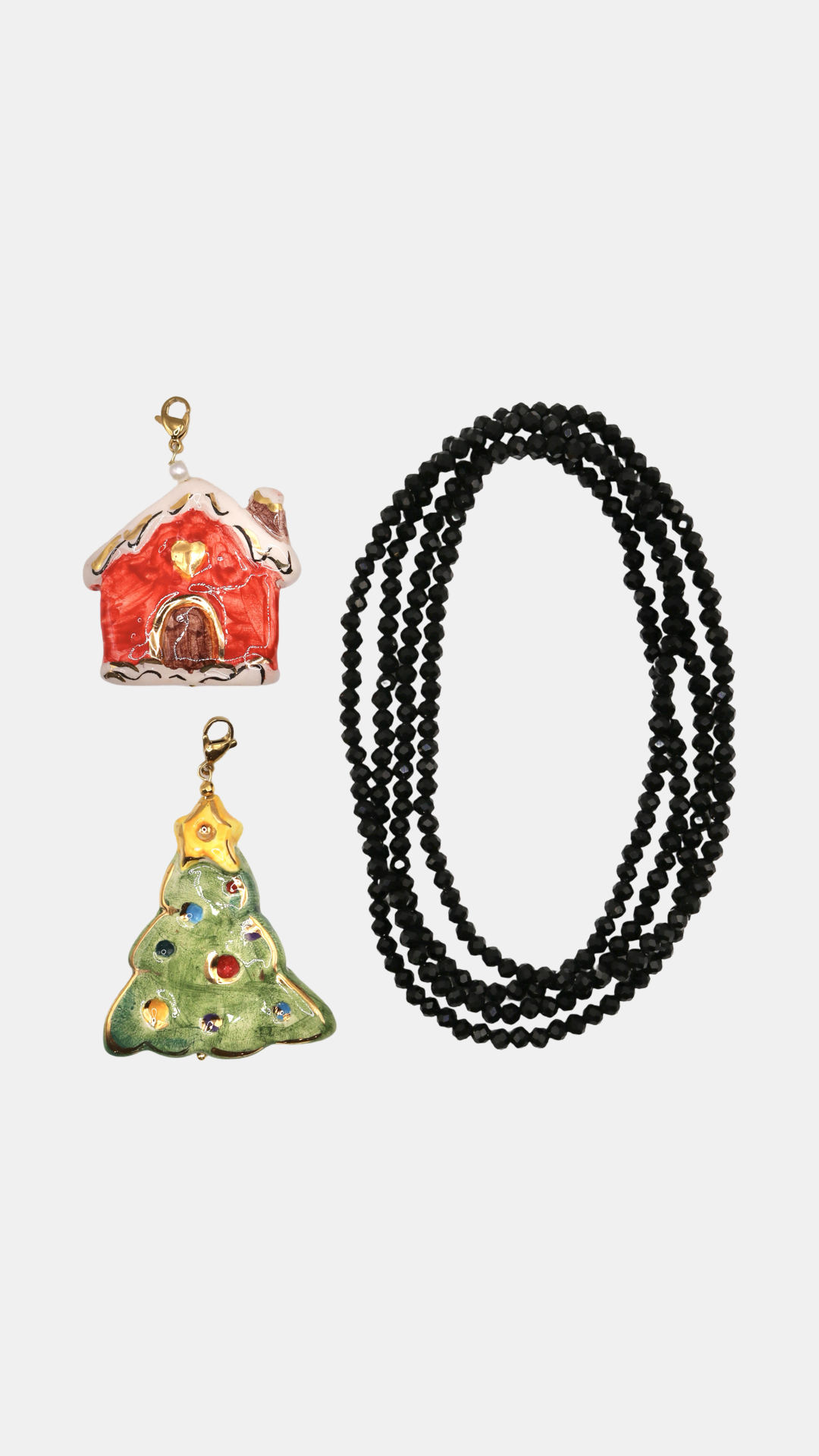 Pack de dos charms de cerámica pintada a mano en edición limitada, compuesto por una casita navideña y un árbol de Navidad. Incluye además una cadena de cuentas de cristal negro facetado, ideal para combinar y crear un accesorio festivo, artesanal y único.