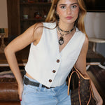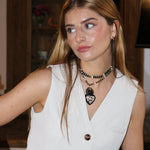 Collar de crochet hecho a mano con cuentas de cristal en tonos negro, blanco y dorado + dije de Sagrado Corazón de cerámica pintado a mano en los mismos colores. Una pieza única, elegante y llena de simbolismo.