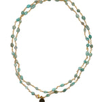 Cadena hecha de pequeñas piedras de amazonita, este mineral ayuda a liberar de ataduras y bloqueos, y fomenta el equilibrio emocional y la seguridad en uno mismo.