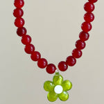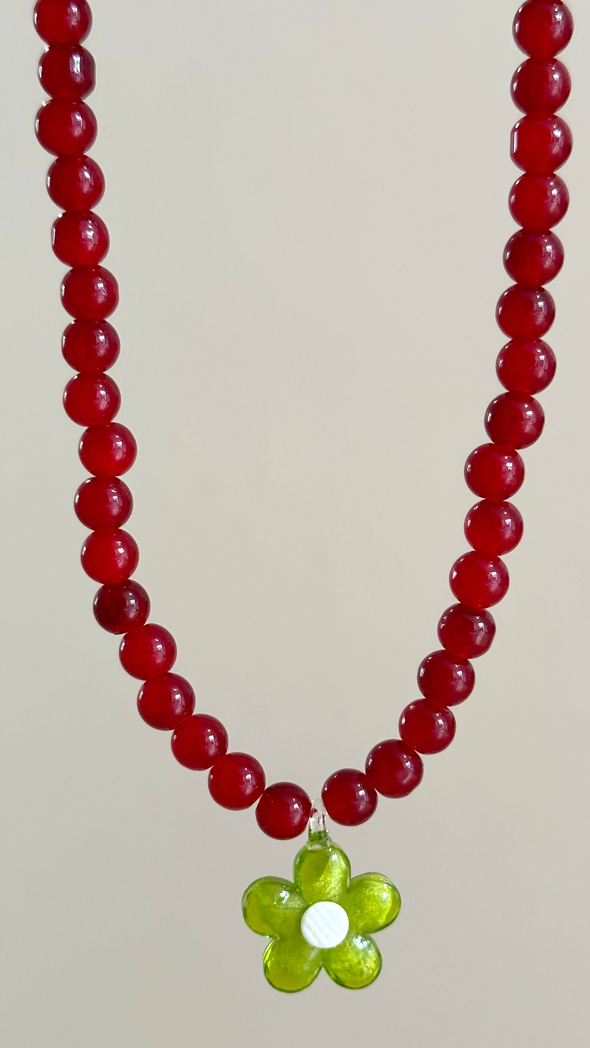 ¡Dale vida a tu look de verano con este collar, hecho a mano súper divertido! Este collar granate, lleno de alegría, está compuesto por piezas de cristal y cuenta con una encantadora flor verde de cristal soplado en el centro que te hará destacar. Diseñado para ajustarse justo al cuello, este collar es ideal para tus aventuras de las niegas, fiestas en la playa o salidas con amigos. Además, cuenta con una cadena alargador de 7 cm para que puedas ajustarlo a la medida perfecta.