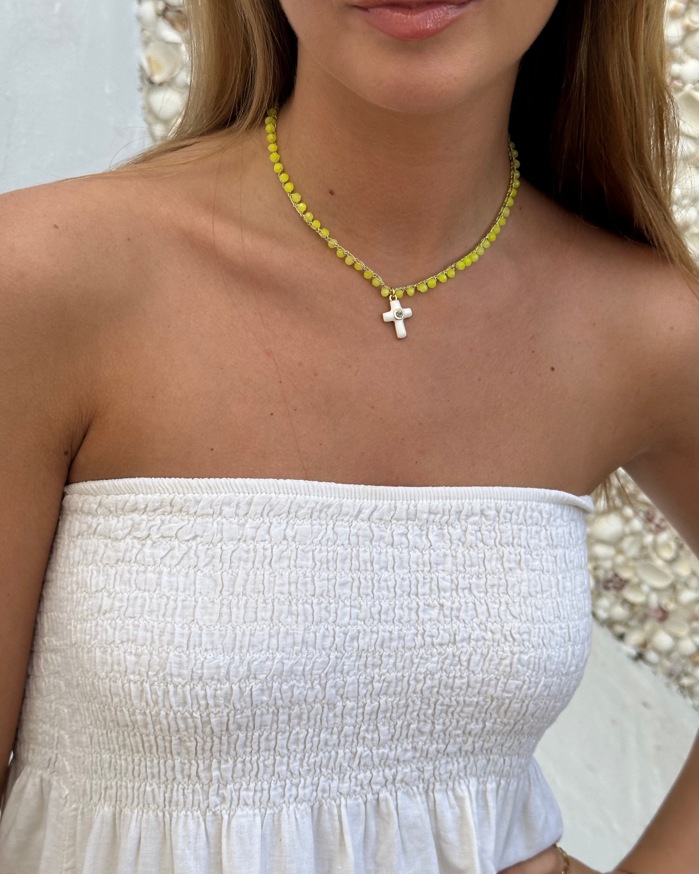 Collar hecho a mano en hilo dorado con técnica de crochet, decorado con cuentas facetadas de cristal que capturan la luz con delicadeza. El diseño se completa con un colgante de cruz esmaltada y chapada en oro, y un cierre artesanal de crochet rematado con perla. Una pieza ligera y luminosa, ideal para el verano. Mide aproximadamente 40 cm.