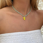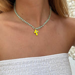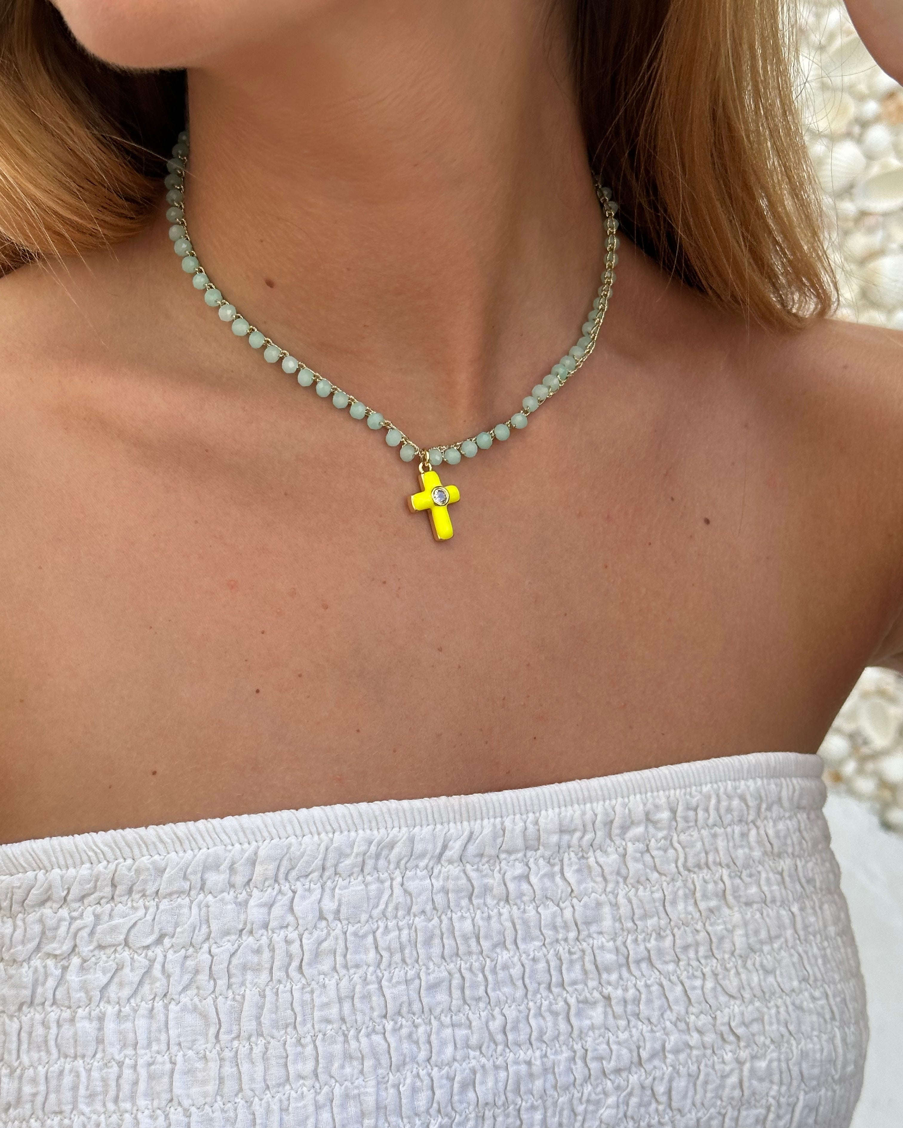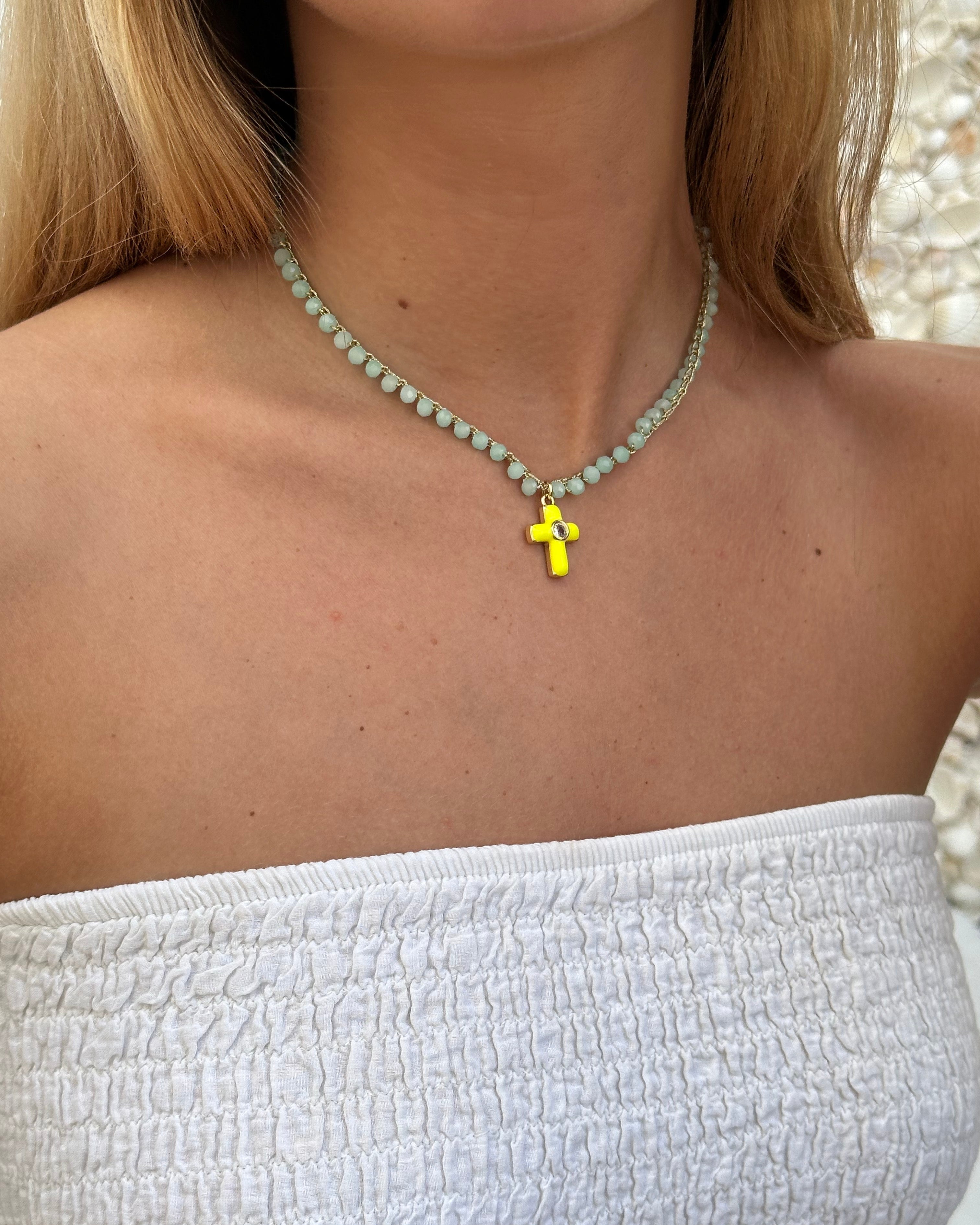 Collar hecho a mano en hilo dorado con técnica de crochet, decorado con cuentas facetadas de cristal que capturan la luz con delicadeza. El diseño se completa con un colgante de cruz esmaltada y chapada en oro, y un cierre artesanal de crochet rematado con perla. Una pieza ligera y luminosa, ideal para el verano. Mide aproximadamente 40 cm.