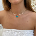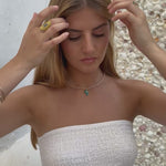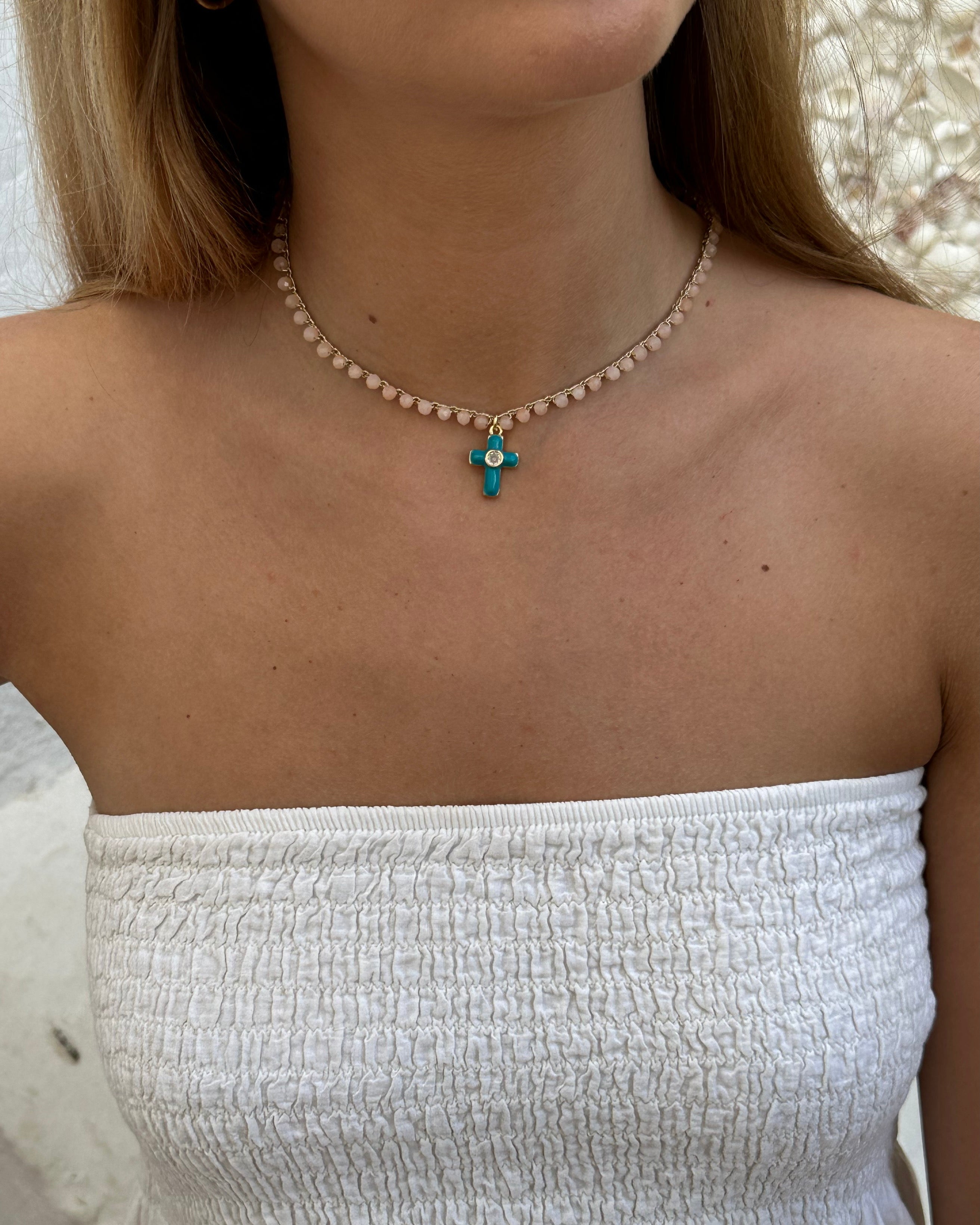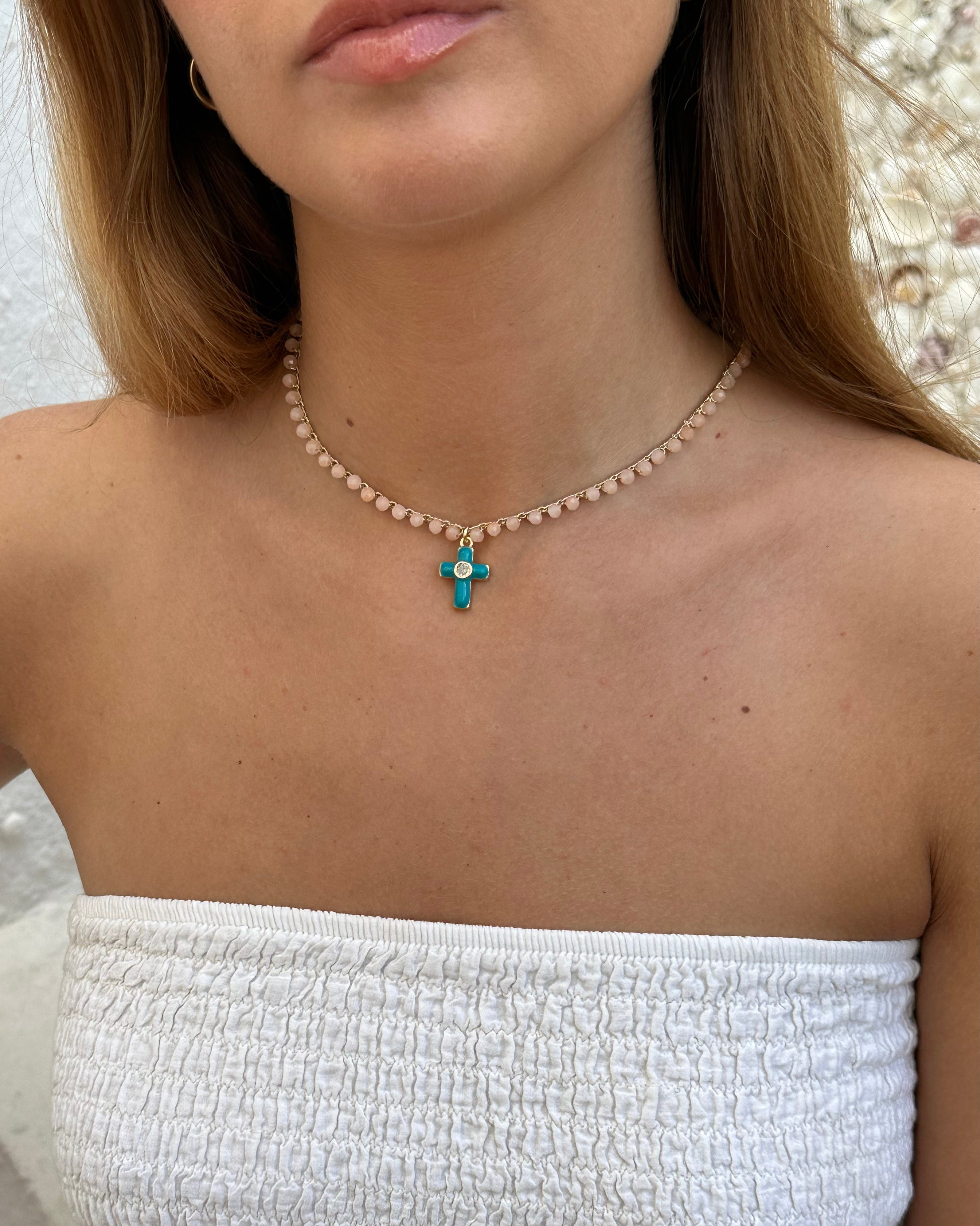 Collar hecho a mano en hilo dorado con técnica de crochet, decorado con cuentas facetadas de cristal que capturan la luz con delicadeza. El diseño se completa con un colgante de cruz esmaltada y chapada en oro, y un cierre artesanal de crochet rematado con perla. Una pieza ligera y luminosa, ideal para el verano. Mide aproximadamente 40 cm.