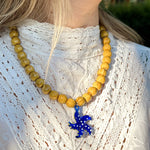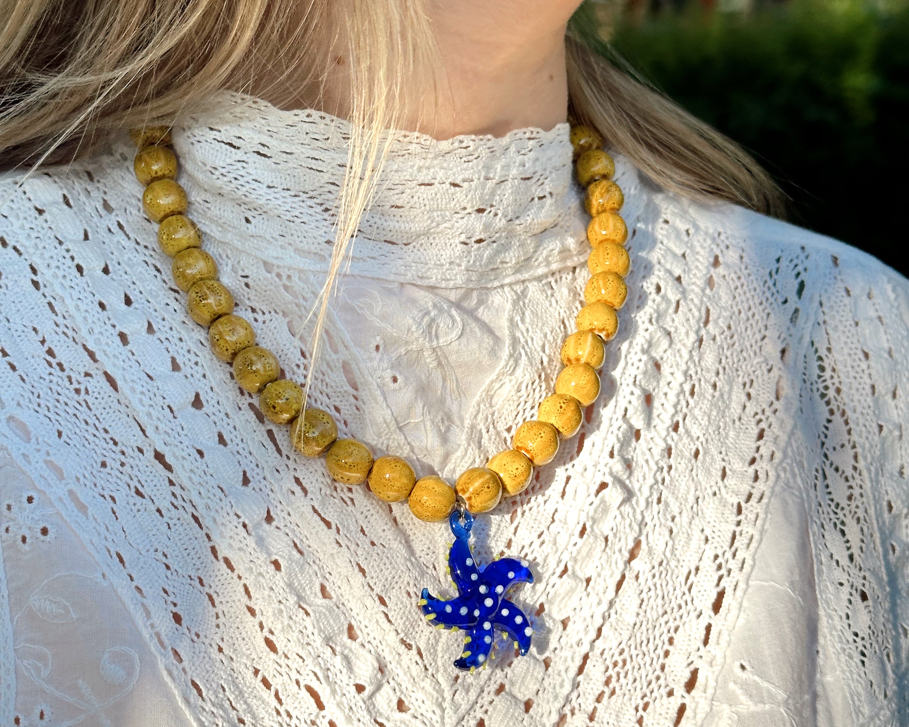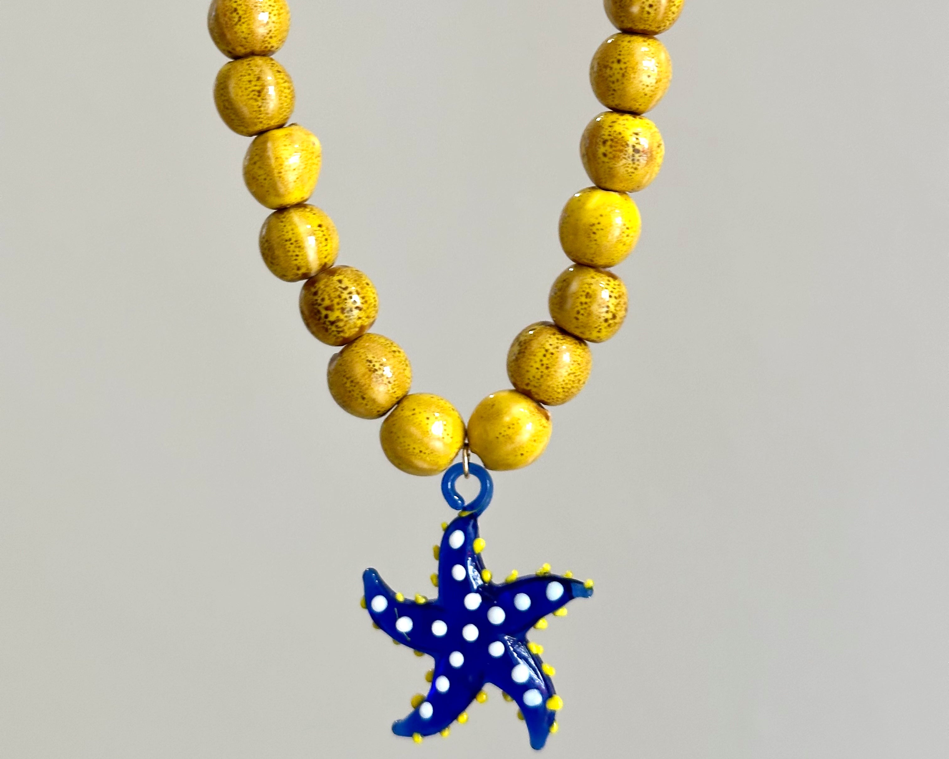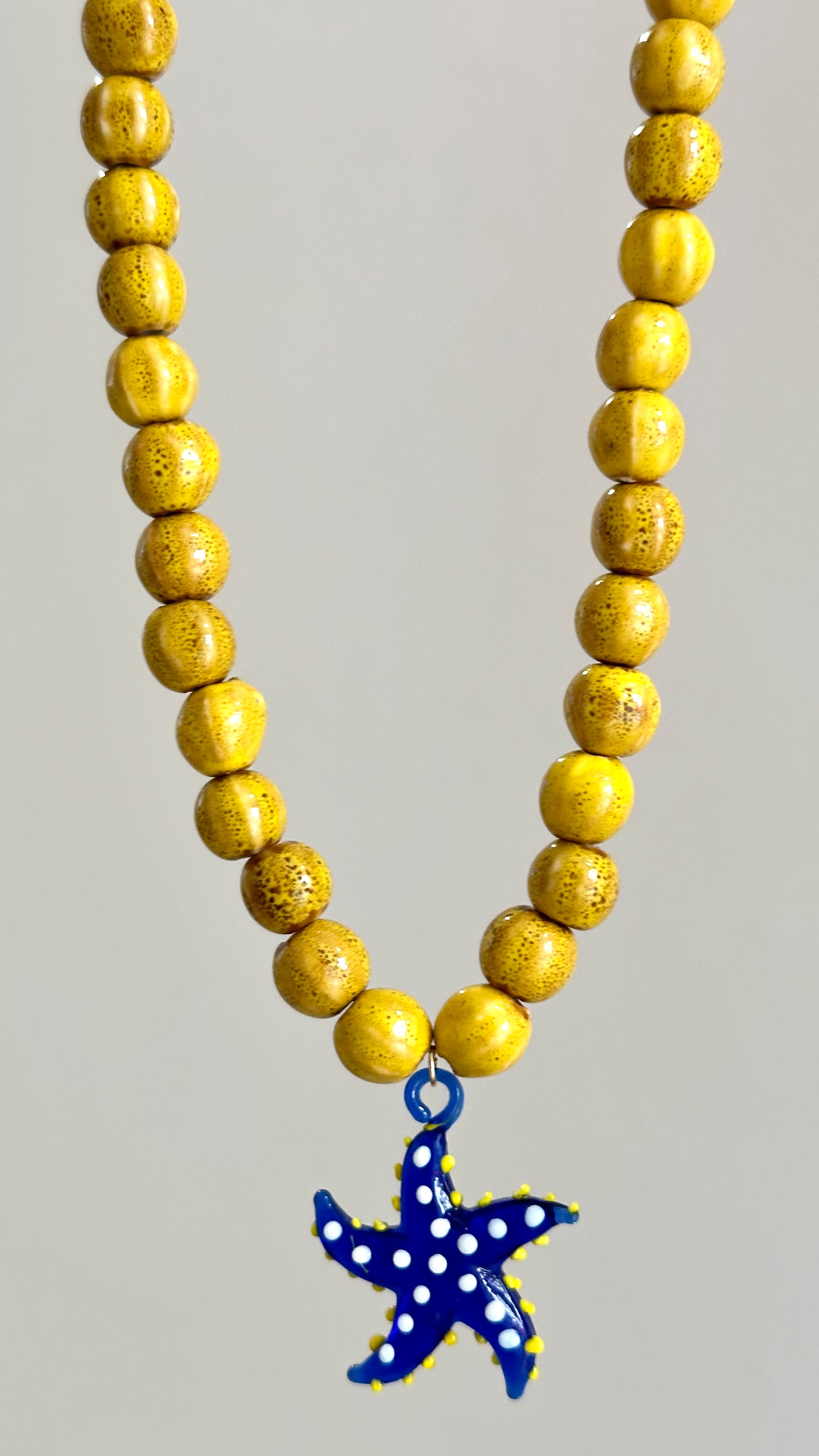 Immerse yourself in artisanal charm with our handmade Patricio necklace. Each ceramic bead tinted in vibrant yellow tells a story of skill and dedication. In the center, a dazzling blue star made of blown glass stands out with yellow and white details, adding a touch of elegance and originality. Measuring 45cm in length, this necklace is a style statement on its own, complemented by a 7cm extender chain to perfectly adjust to your wearing preference.