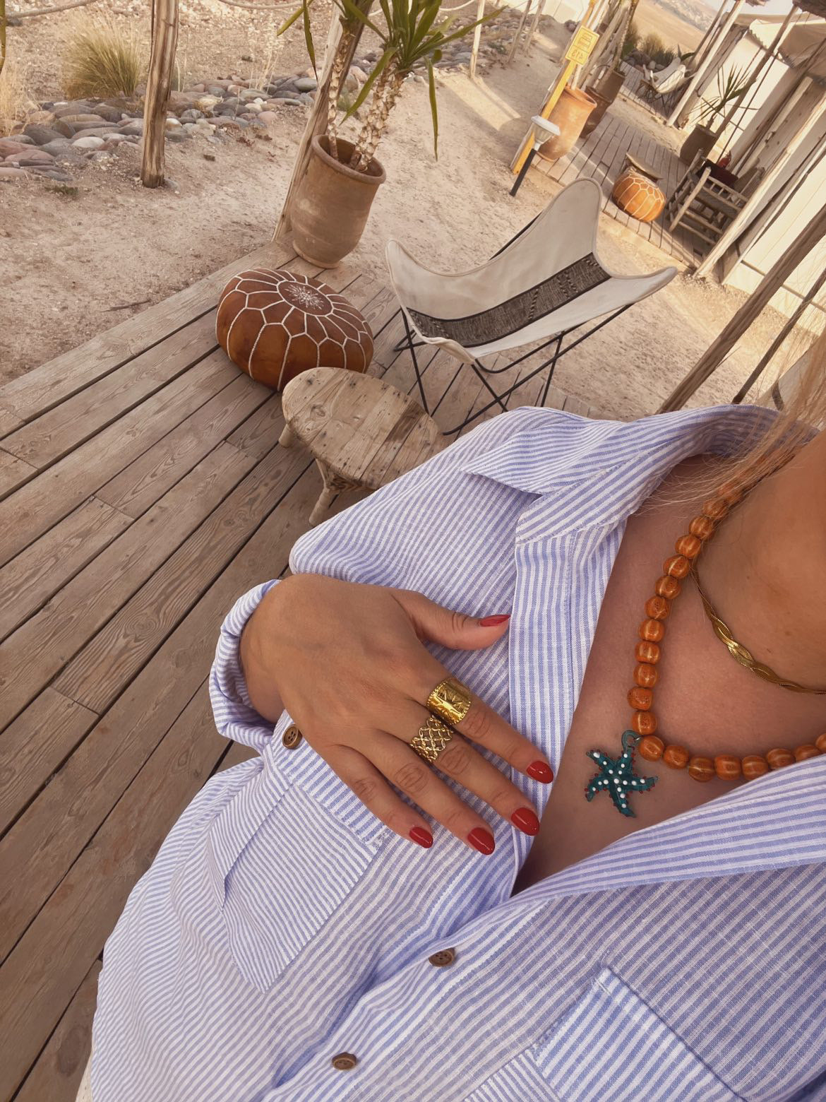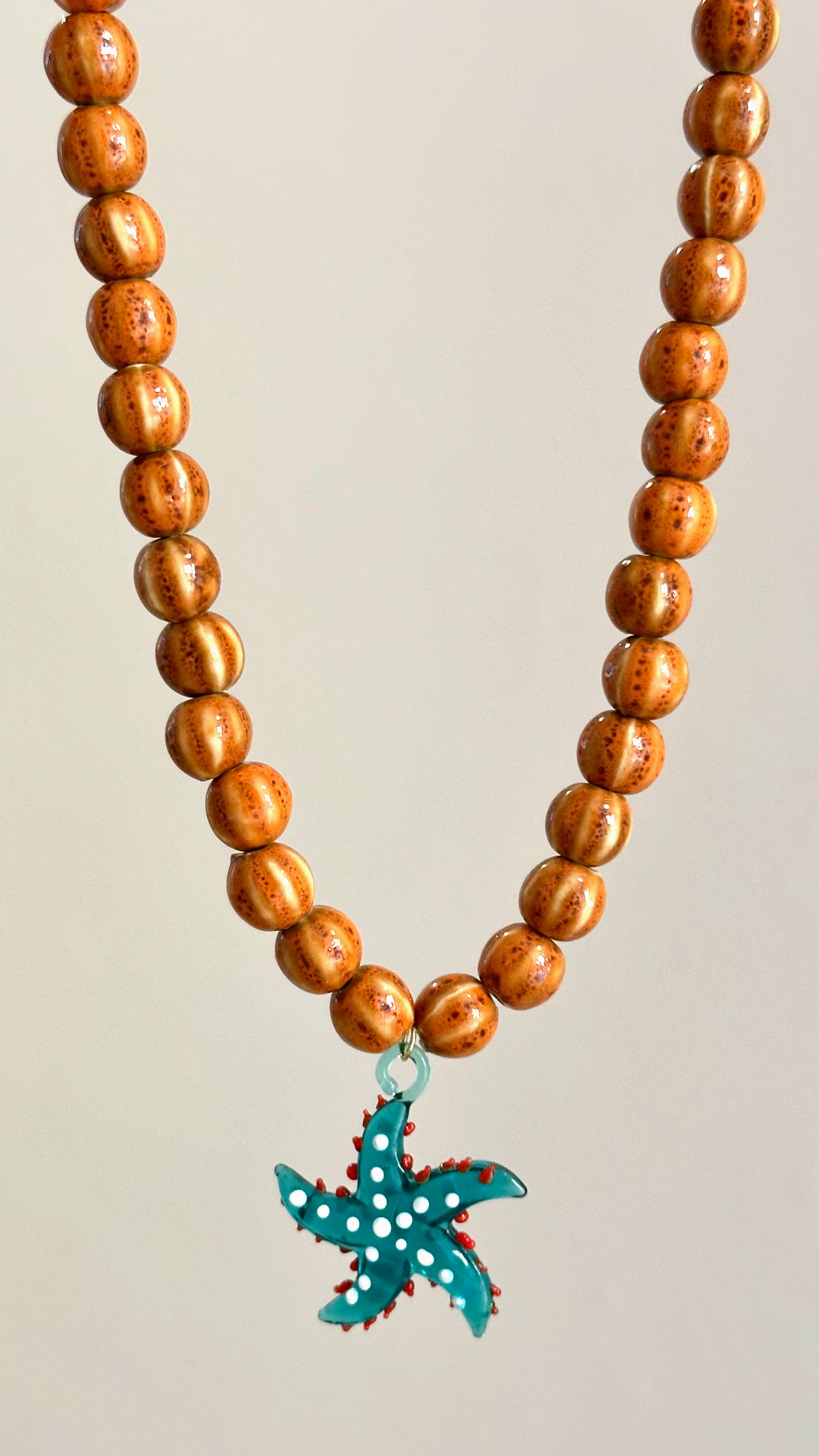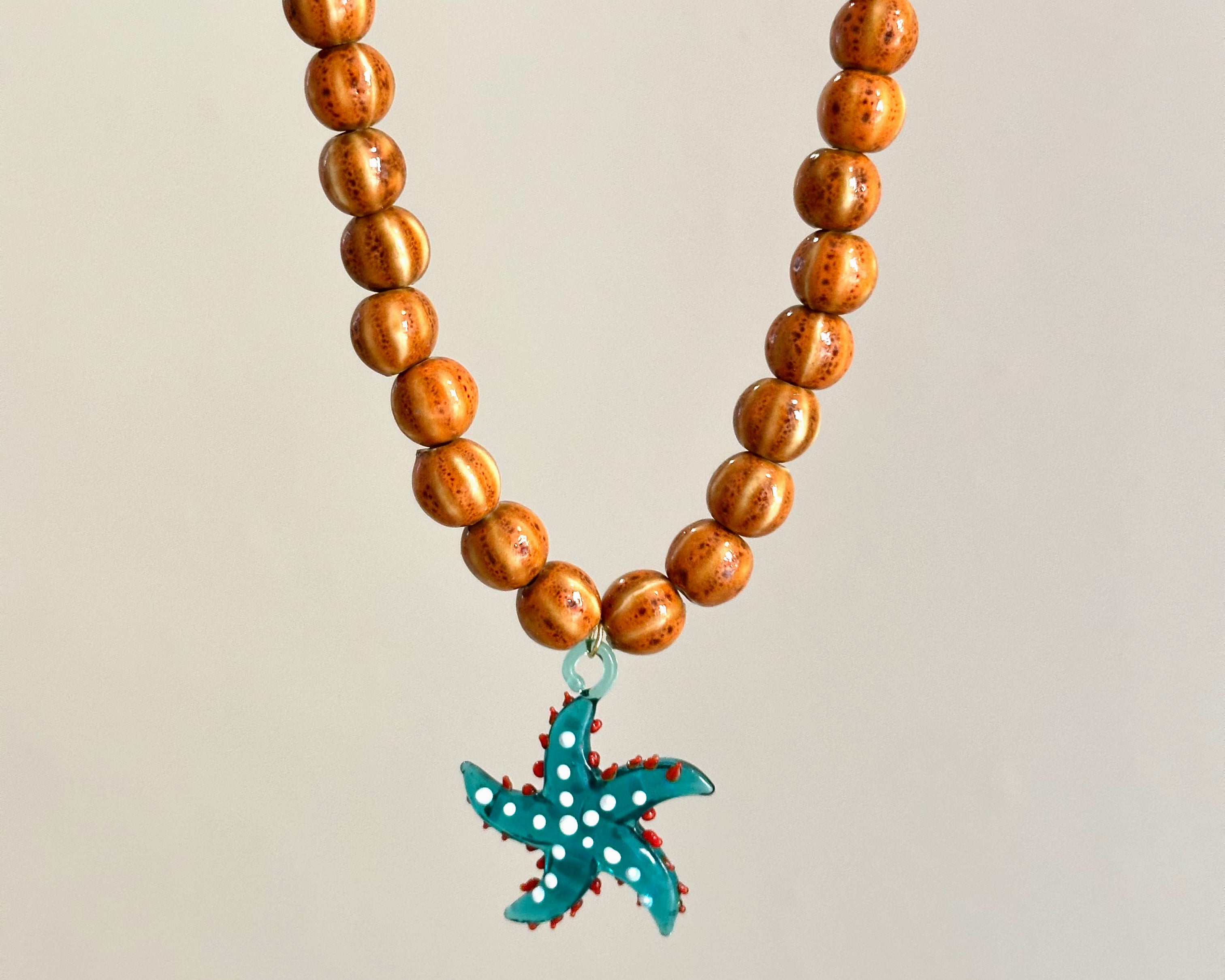 Immerse yourself in artisanal charm with our handmade Patricio necklace. Each ceramic bead tinted in vibrant orange tells a story of skill and dedication. In the center, a dazzling blue star made of blown glass stands out with white and red details, adding a touch of elegance and originality. Measuring 45cm in length, this necklace is a style statement on its own, complemented by a 7cm extender chain to perfectly adjust to your wearing preference.