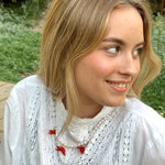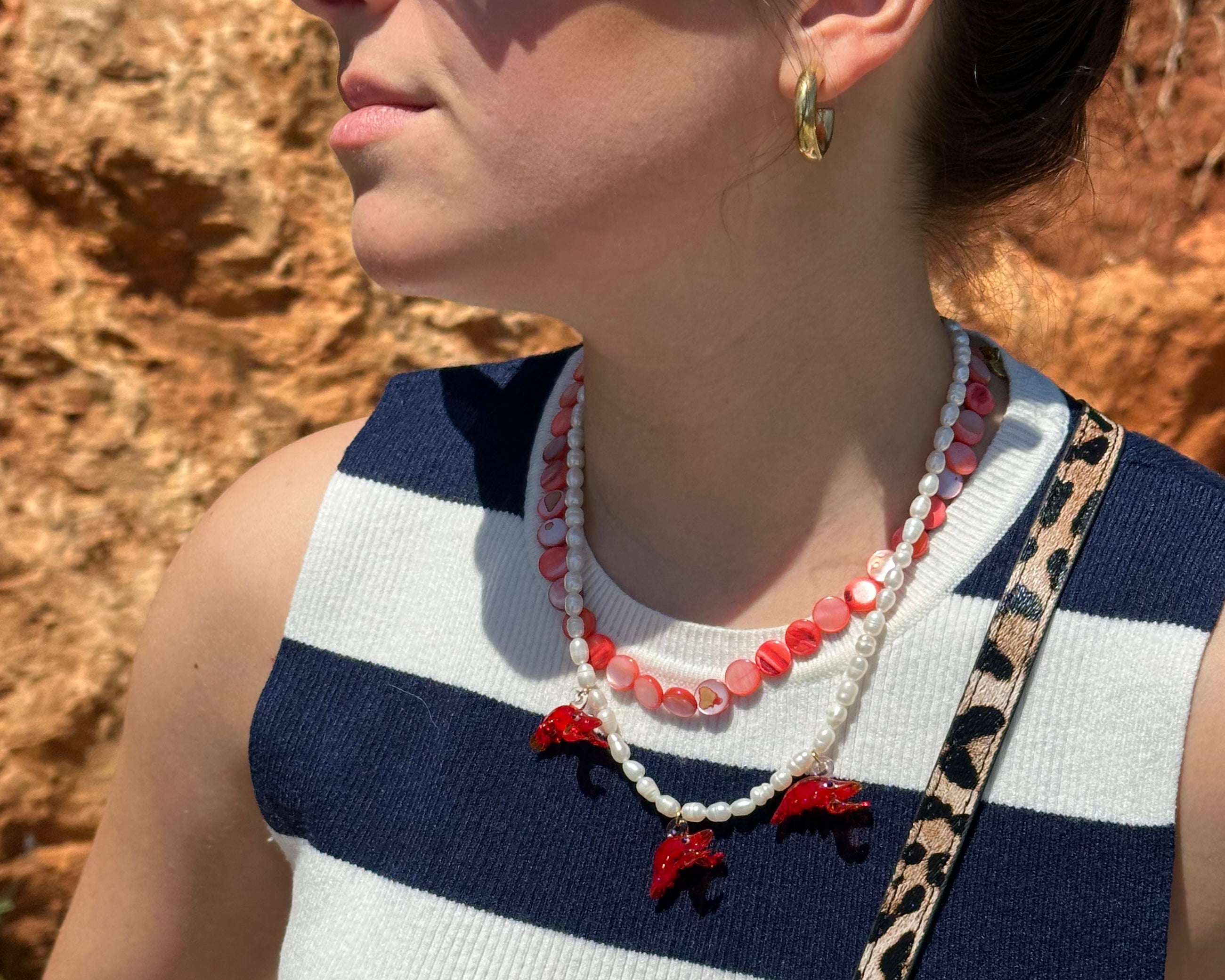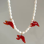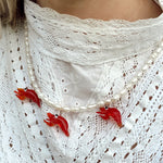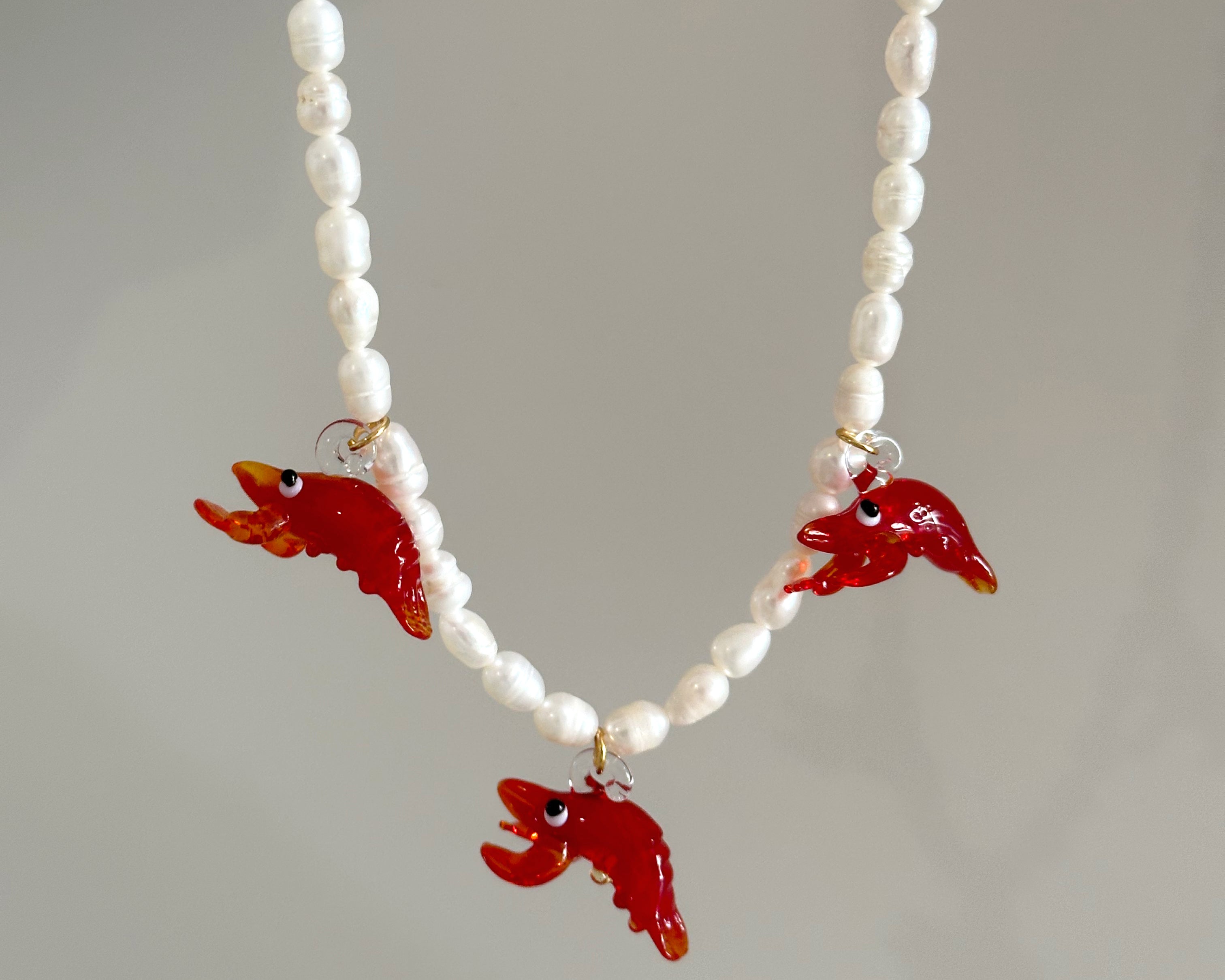 Embark on a journey of elegance with our handmade necklace, made with river pearls and three charming red blown glass shrimps. Each unique and delicate pearl adds a touch of natural refinement to the piece. The blown glass shrimps give a touch of color and originality. With a length of 40 cm and an extended chain of 7 cm. This necklace fits any occasion and style. Turn heads with this unique necklace that fuses the beauty of nature with expert craftsmanship.