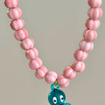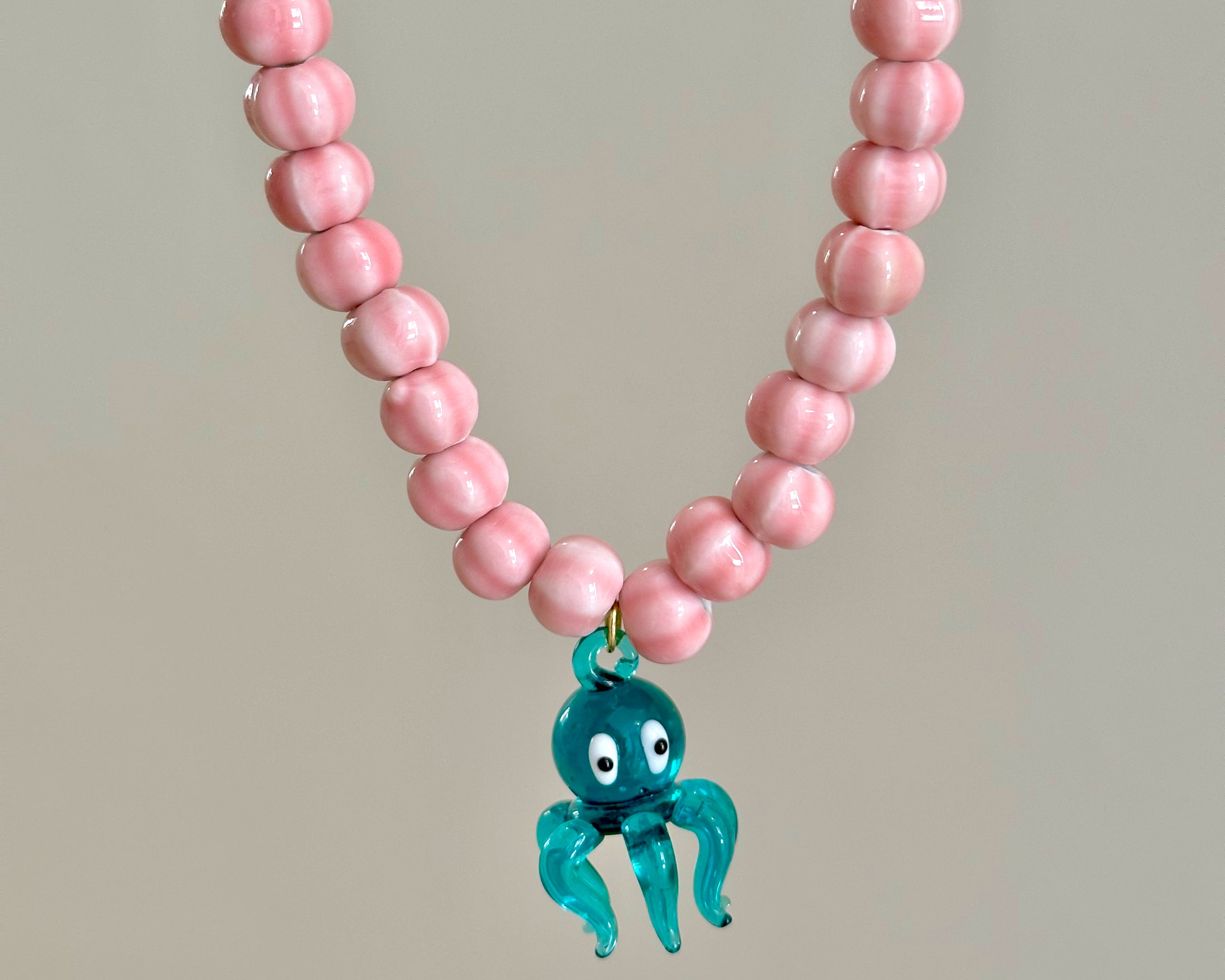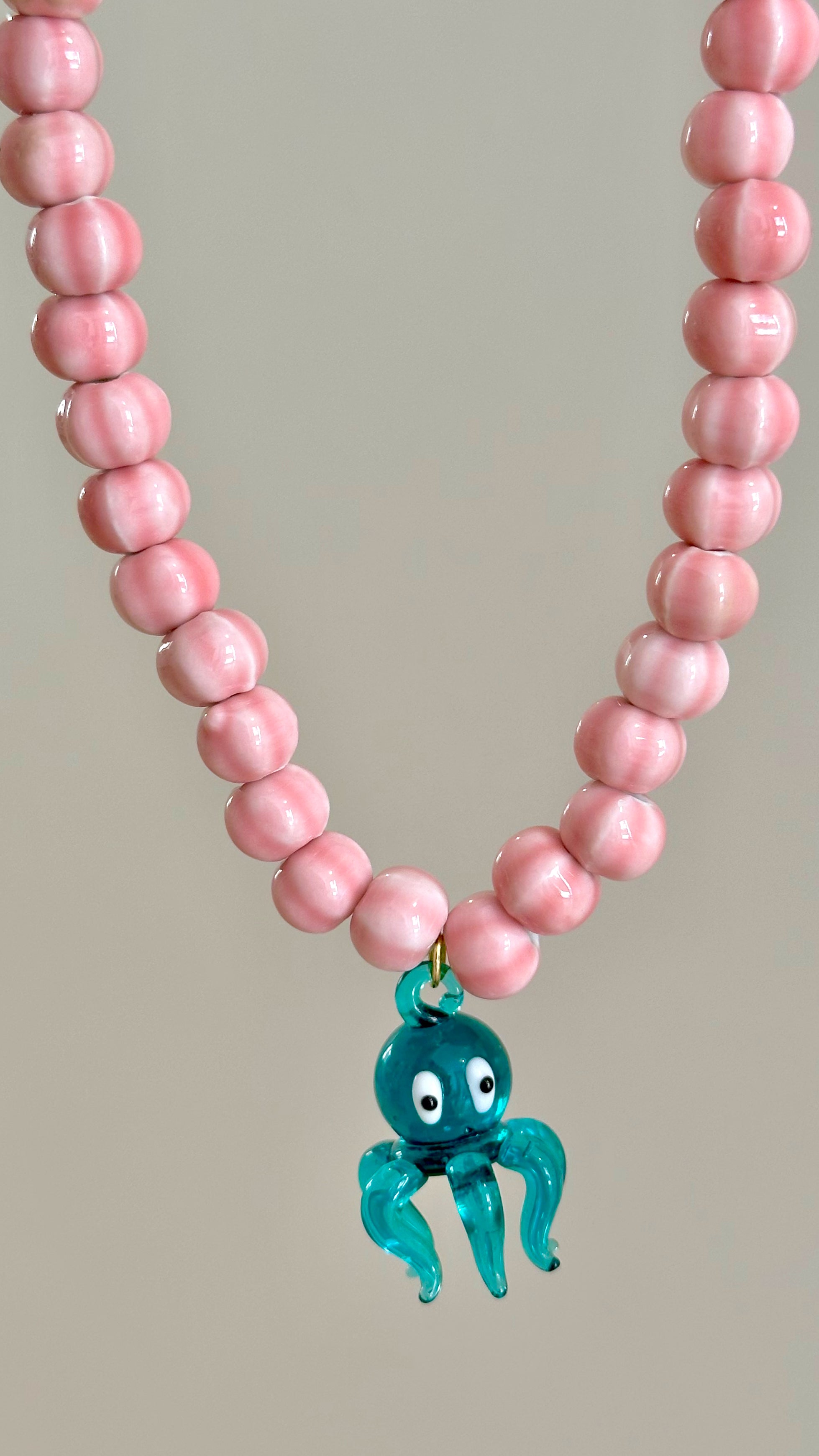 Descubre la exquisitez artesanal con nuestro collar hecho a mano, una obra maestra de elegancia y originalidad. Cada cuenta de cerámica, cuidadosamente pintada en un rosa resplandeciente, refleja la habilidad y la pasión de nuestros artesanos. El pulpo central, elaborado con precisión en cristal soplado, añade un toque de gracia y sofisticación a la pieza. Con una longitud de 45 cm y una cadena alarga de 7 cm, este collar se adapta perfectamente a cualquier ocasión, desde eventos formales hasta salidas casuales.
